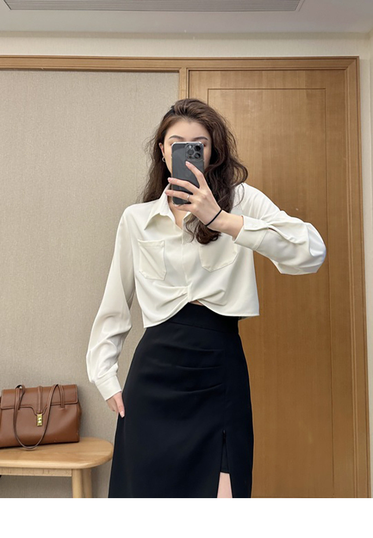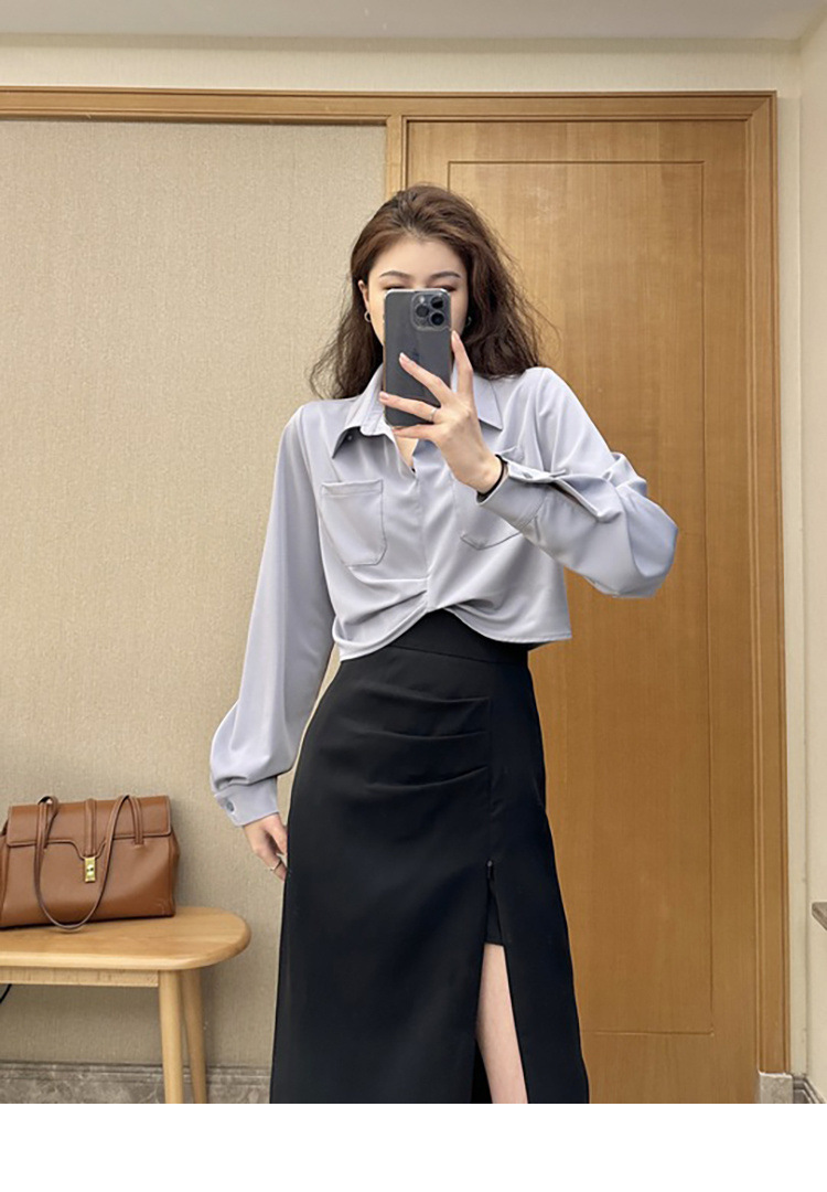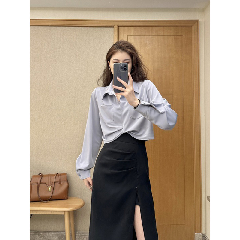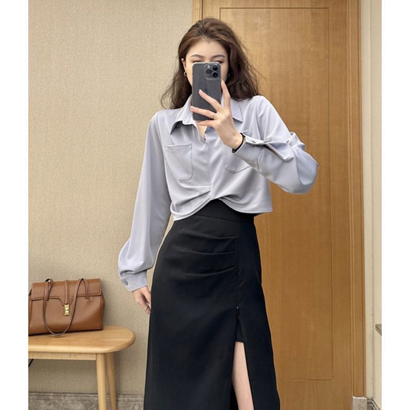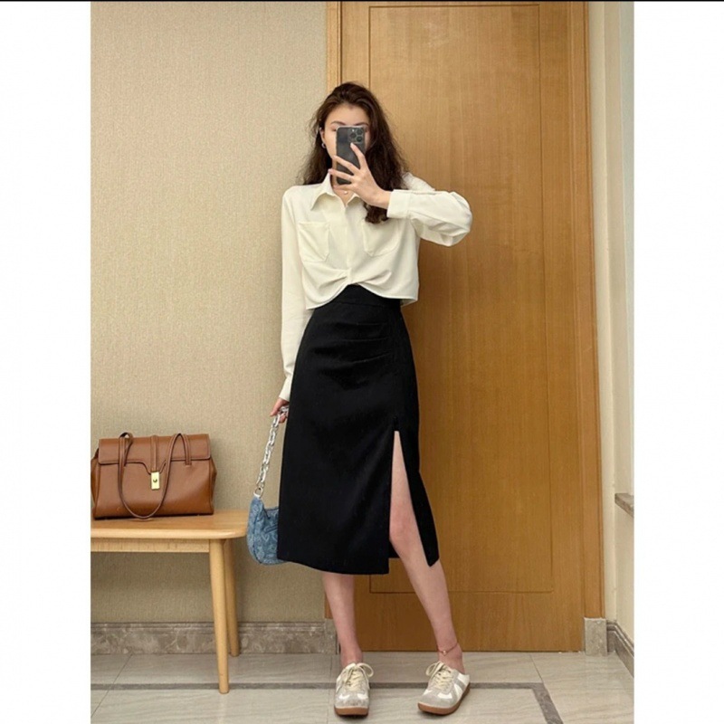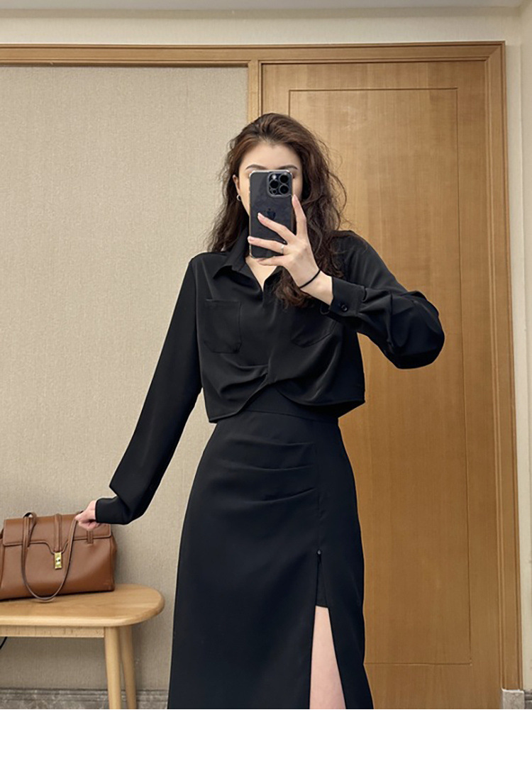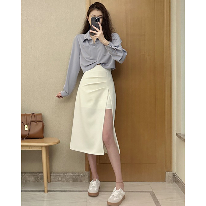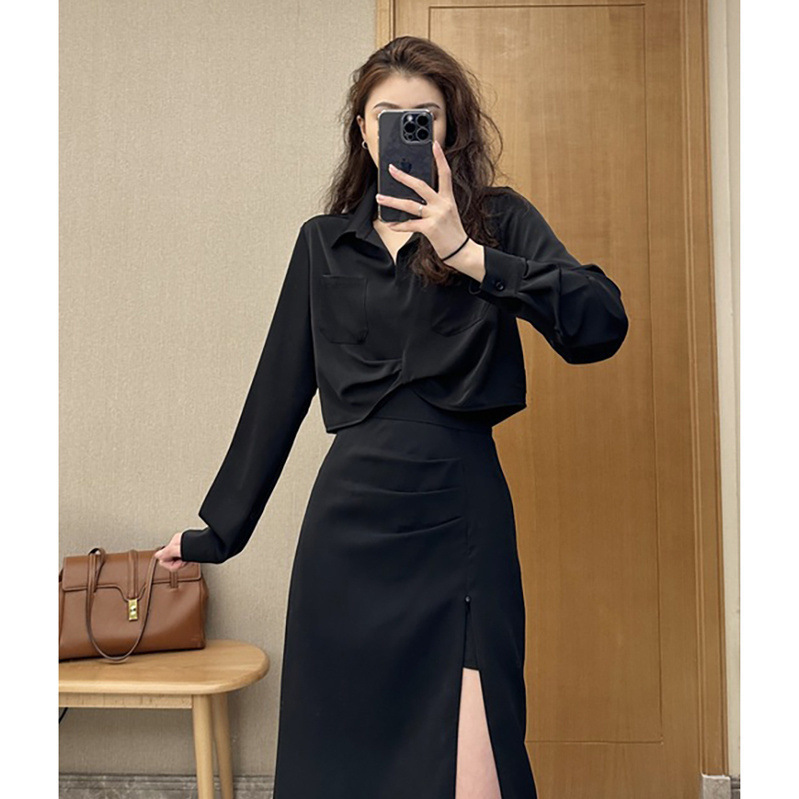 장아 싱 2025 봄 새로운 허리 주름 슬림 셔츠 지퍼 조정 가능한 벤트 스커트 2 피스 세트