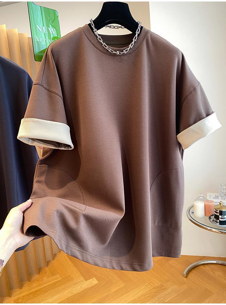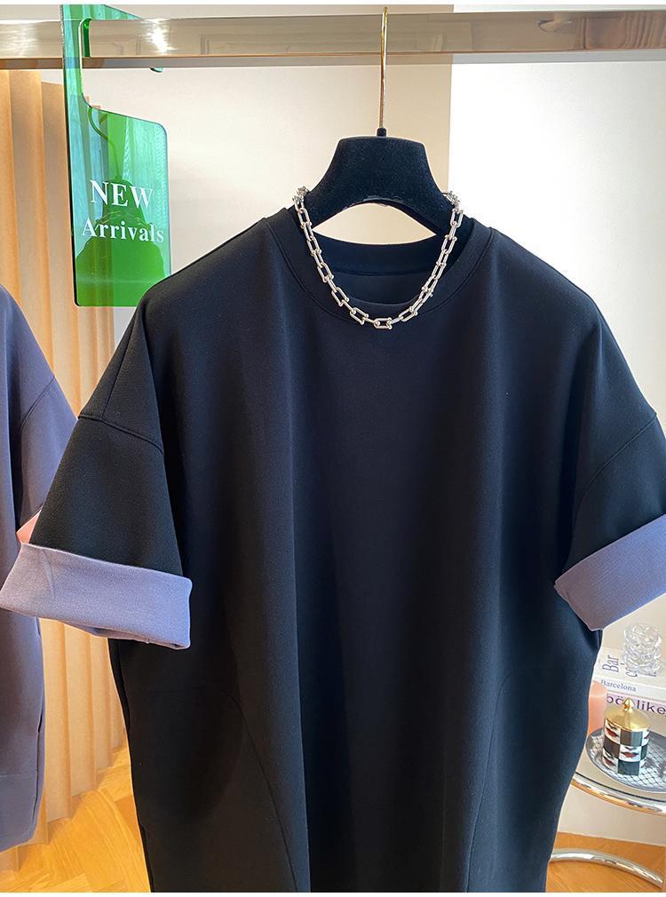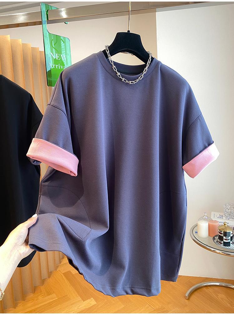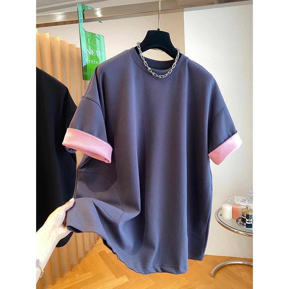 오버 사이즈 300 진 콘트라스트 커프 크루 넥 티셔츠 남성과 여성의 여름 새로운 루즈 조커 짧은 소매 티셔츠 재킷