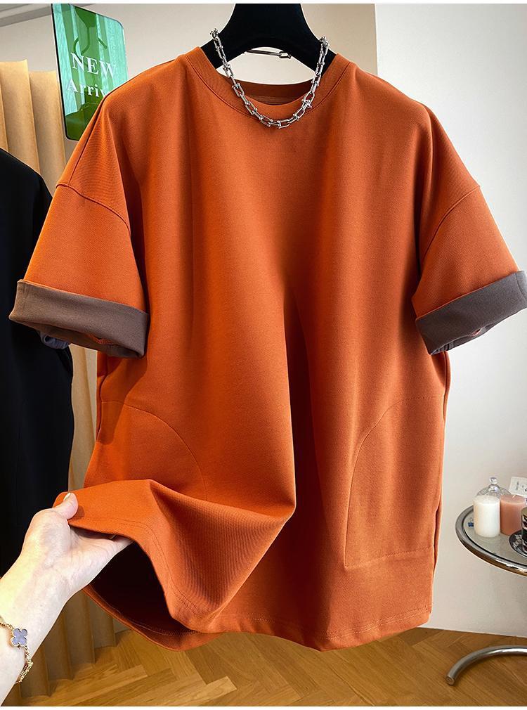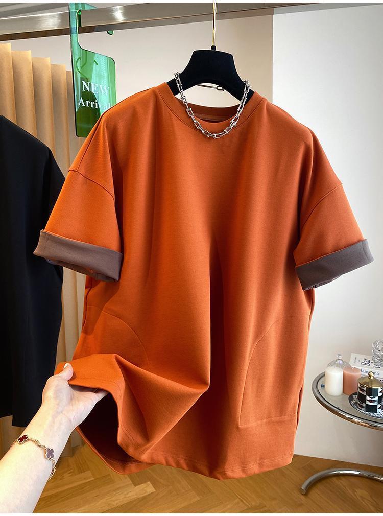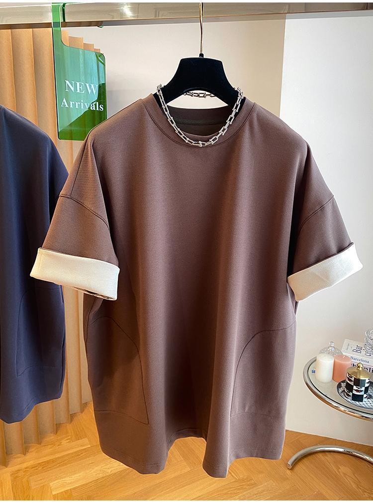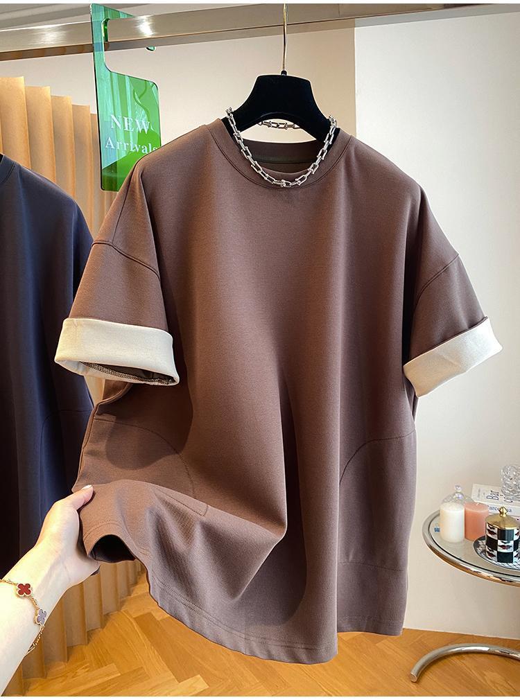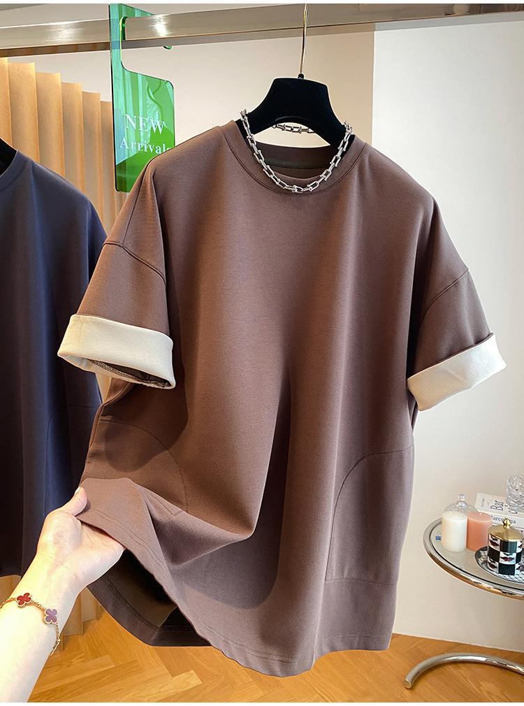 오버 사이즈 300 진 콘트라스트 커프 크루 넥 티셔츠 남성과 여성의 여름 새로운 루즈 조커 짧은 소매 티셔츠 재킷