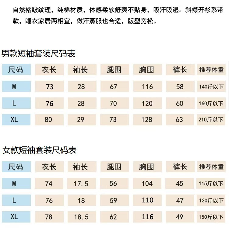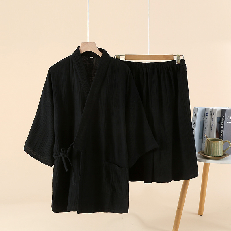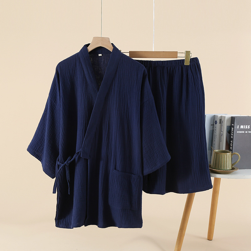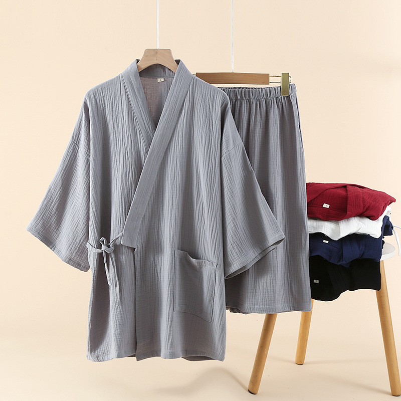 커플의 크레페 반팔 반바지 기모노 봄과 여름 얇은 암호화 플러스 사이즈 일본식 레이스 업 스웨트 남녀 홈 의류스토어 가기