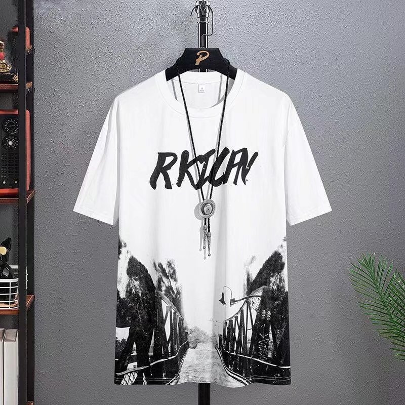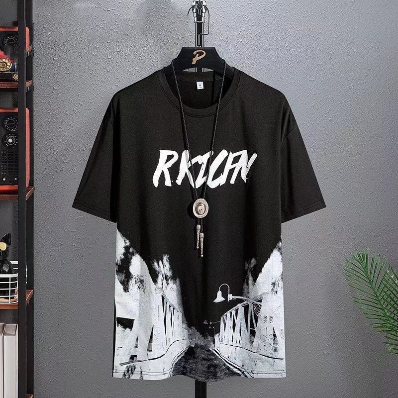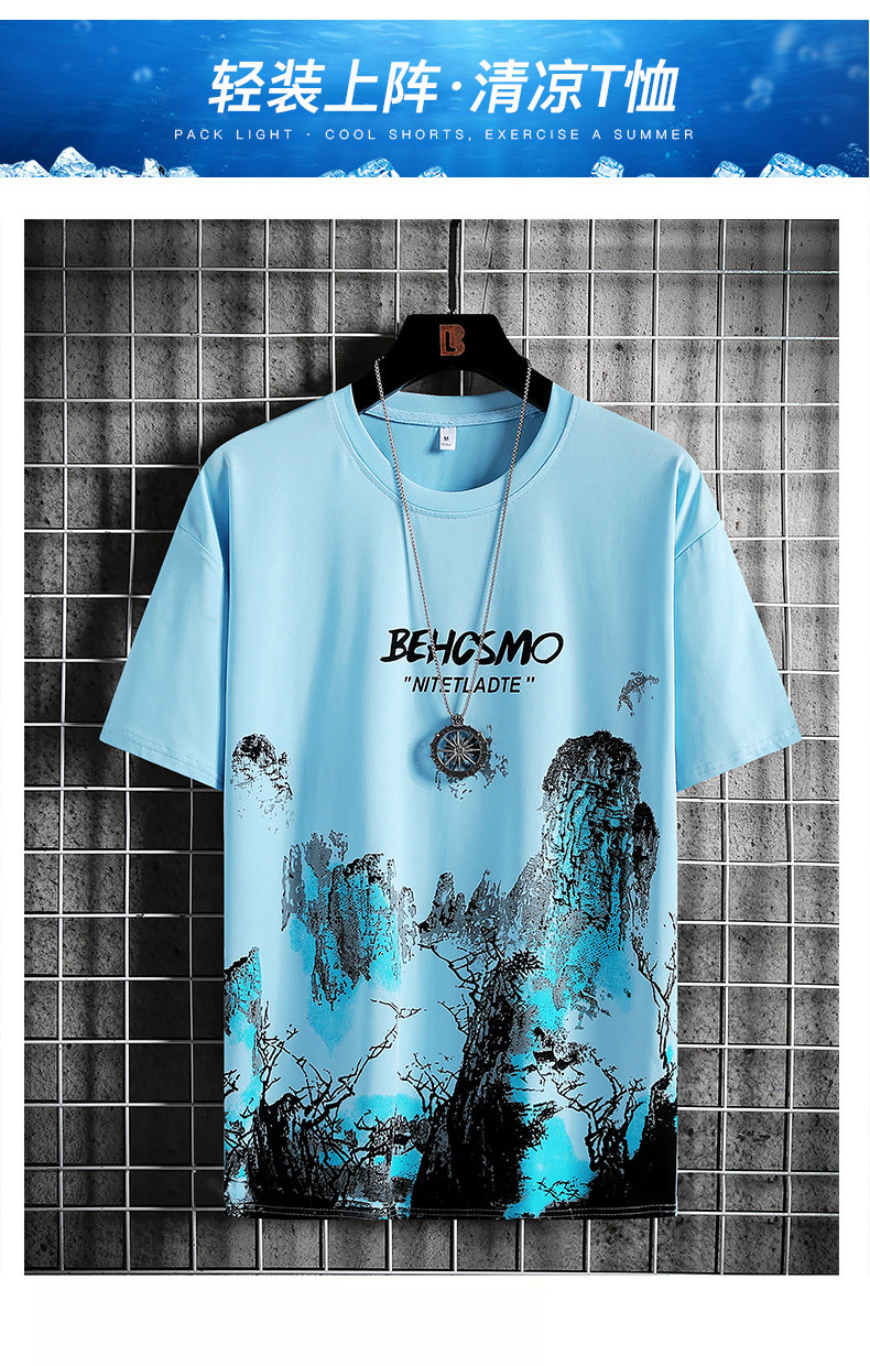 남자 여름 새로운 얇은 타이-염색 반팔 반팔 국가 스타일 풍경 그림 아이스 실크 빠른 건조 라운드 넥 캐주얼 반바지 세트스토어 가기