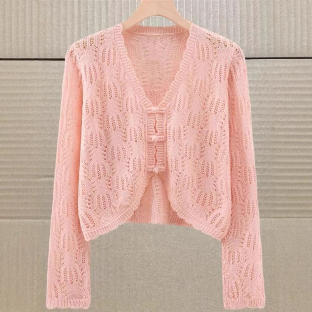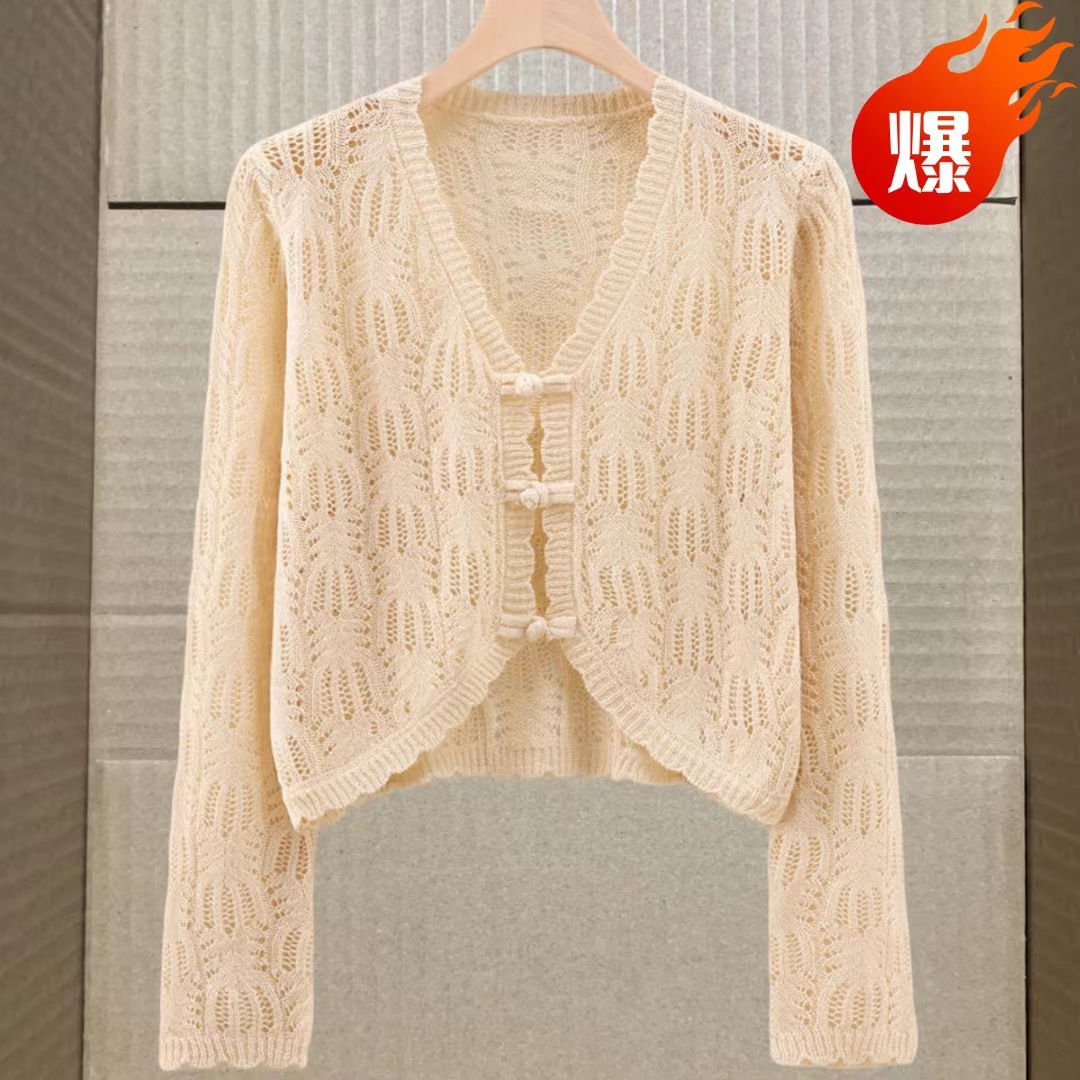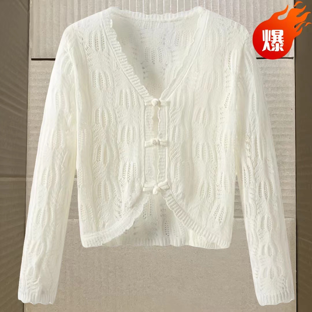 새로운 중국 스타일 디자인 화이트 할로우 니트 카디건 여성의 짧은 슬림 핏 올 매치 숄이 니트 카디건