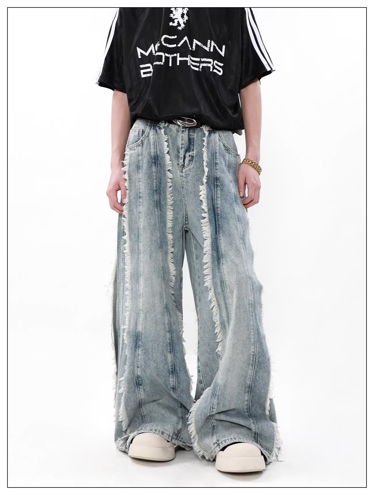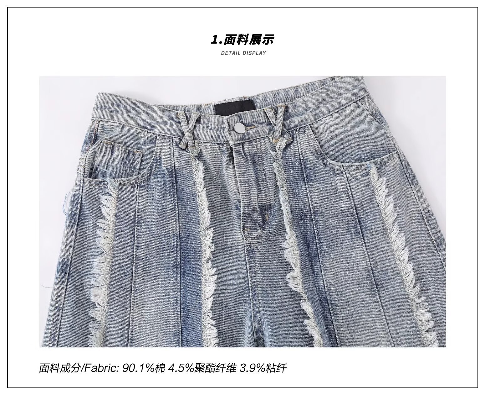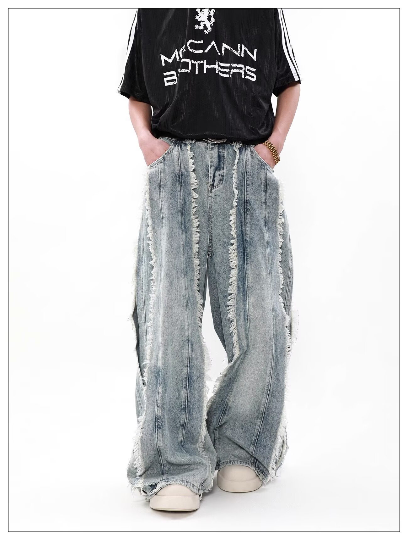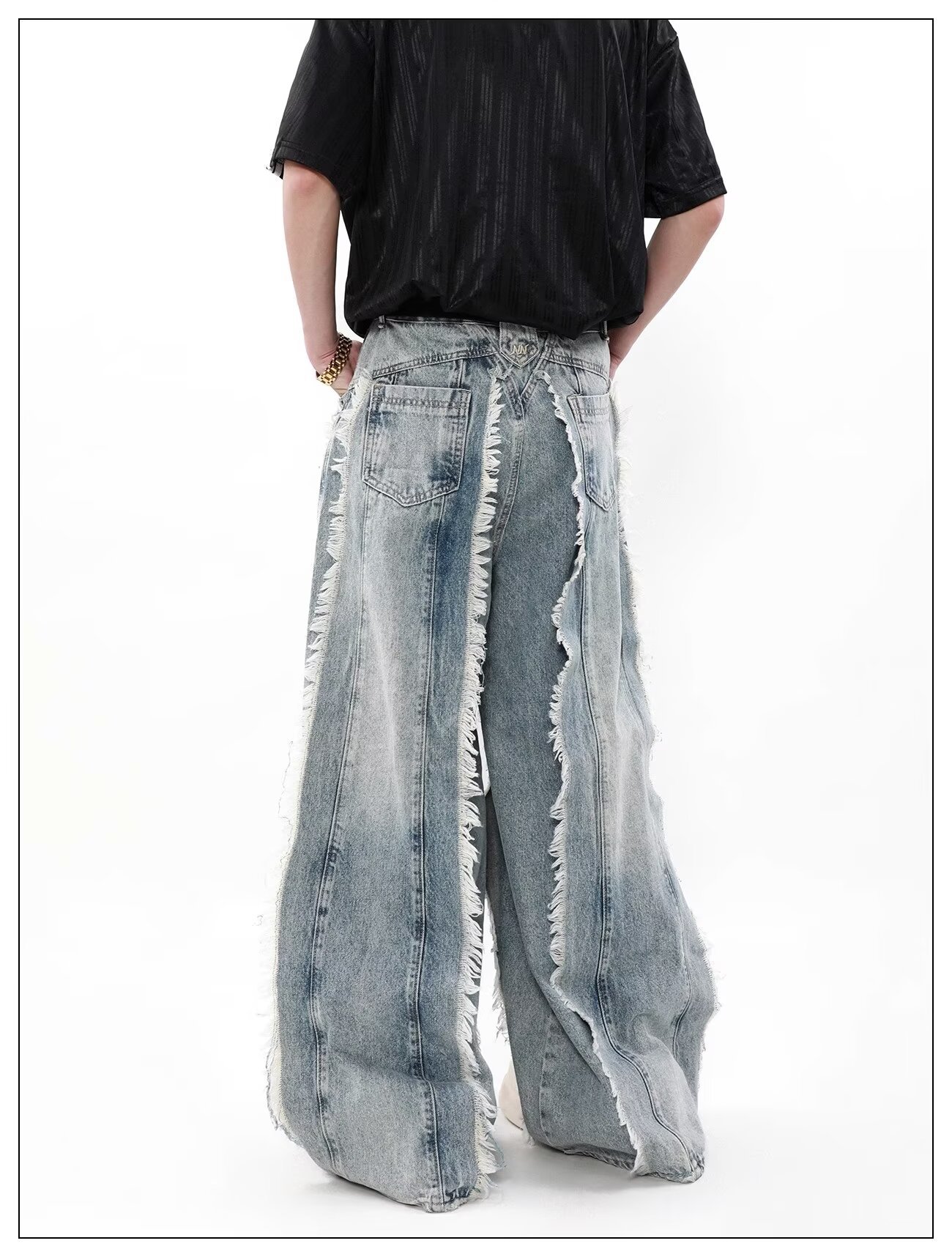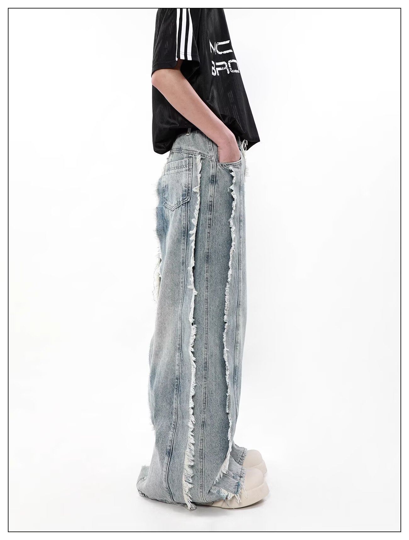 국경 간 폭발 미국 스타일 레트로 폐기물 토양 스타일 술 스티칭 디자인 센스 청바지 남성 틈새 느슨한 와이드 레그 트렌디 바지