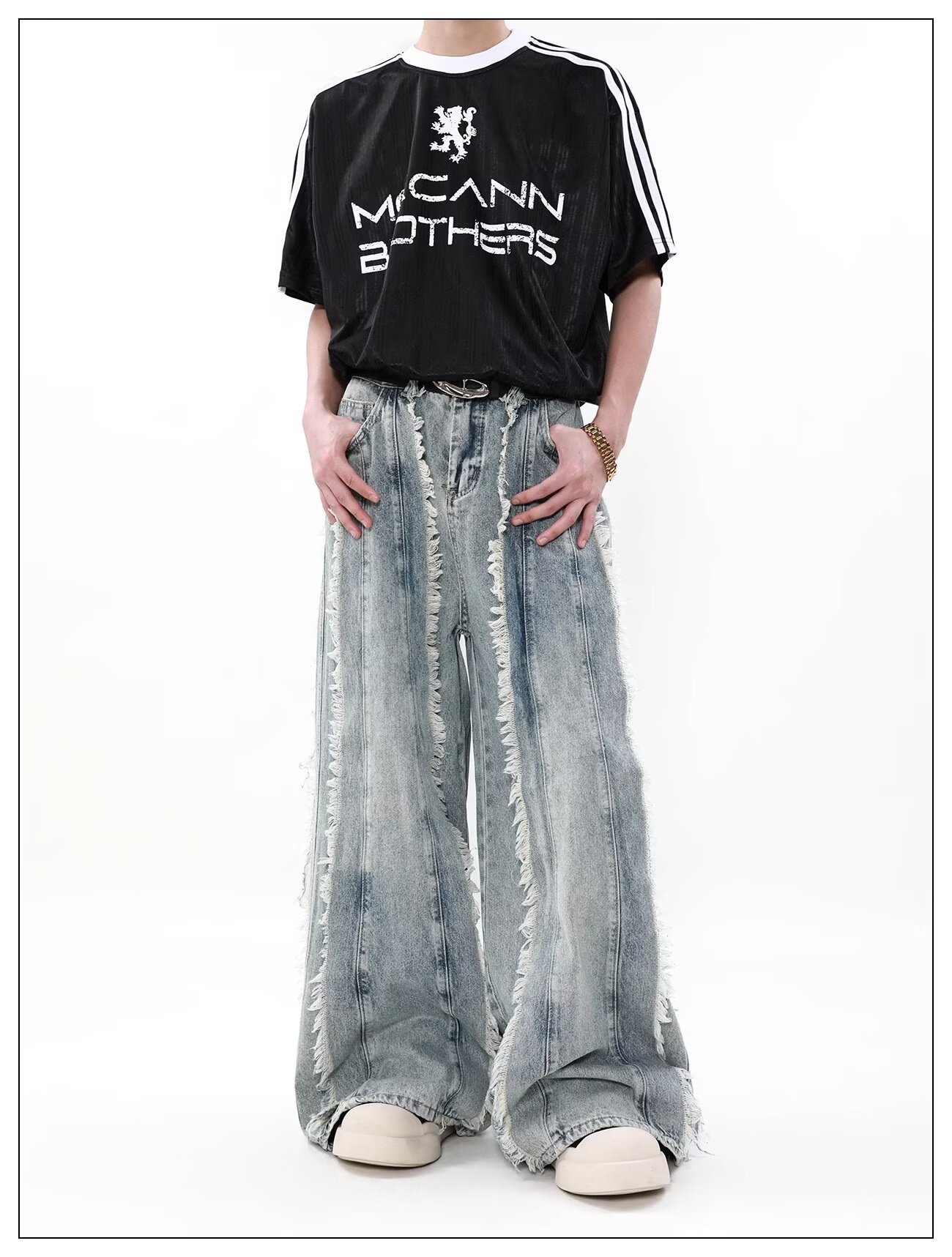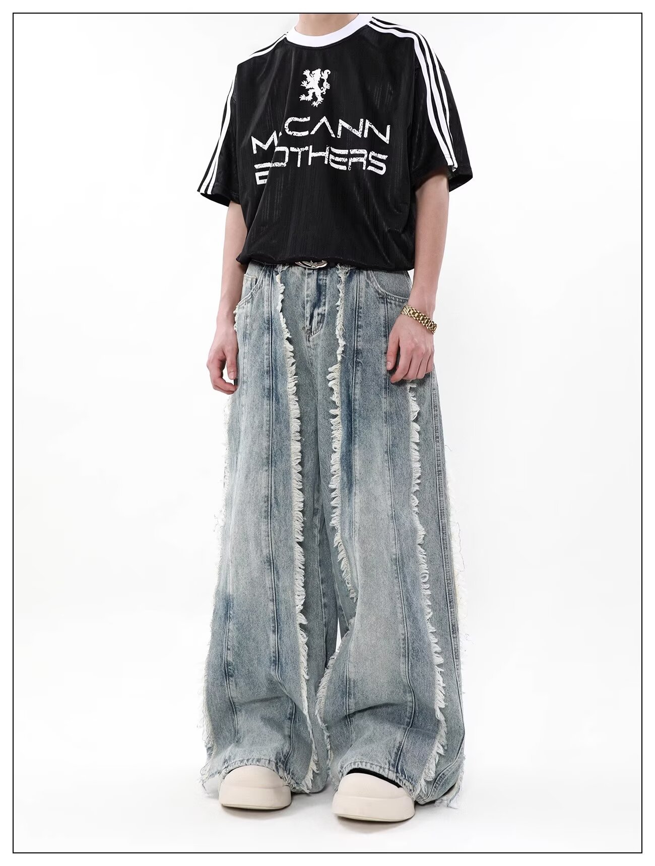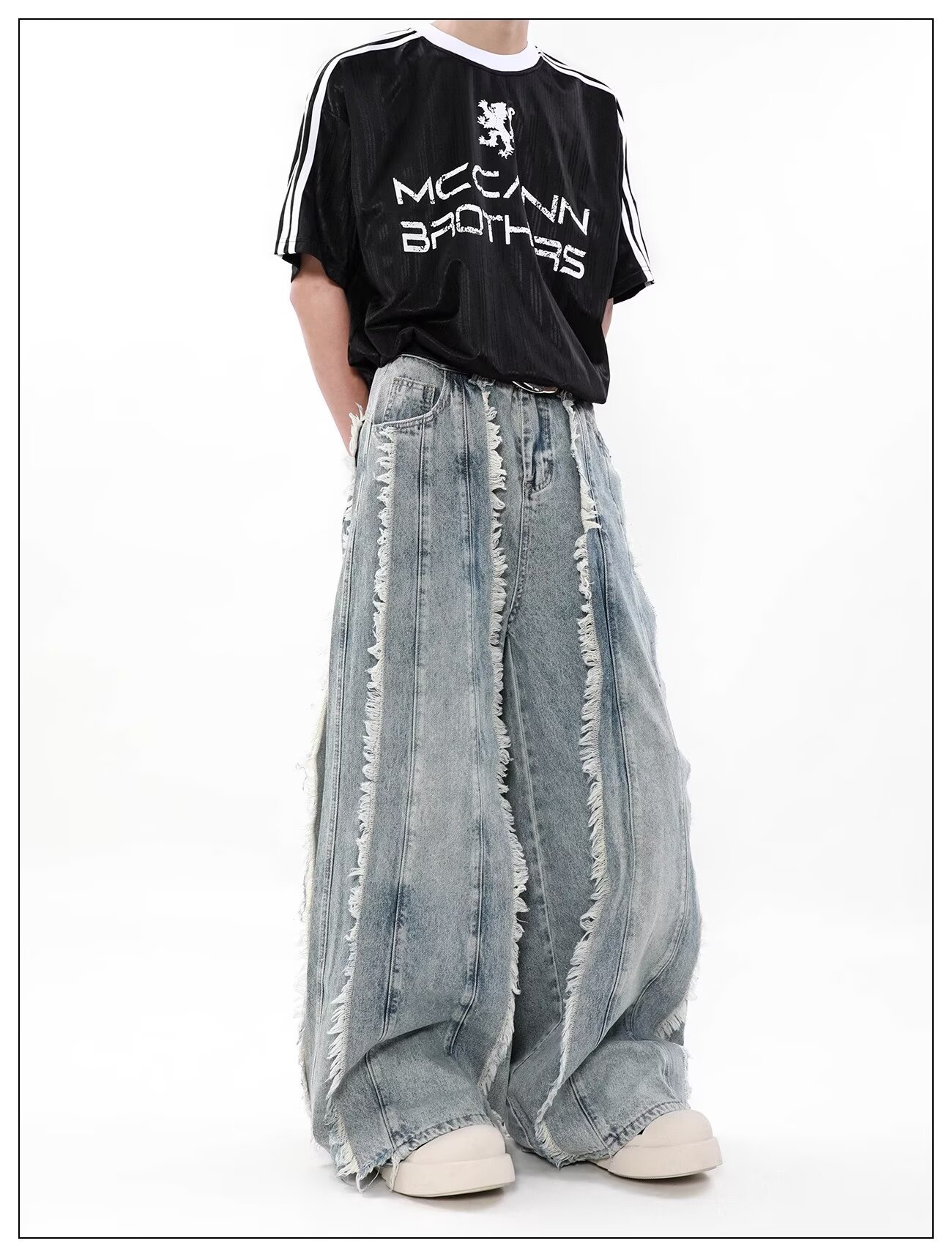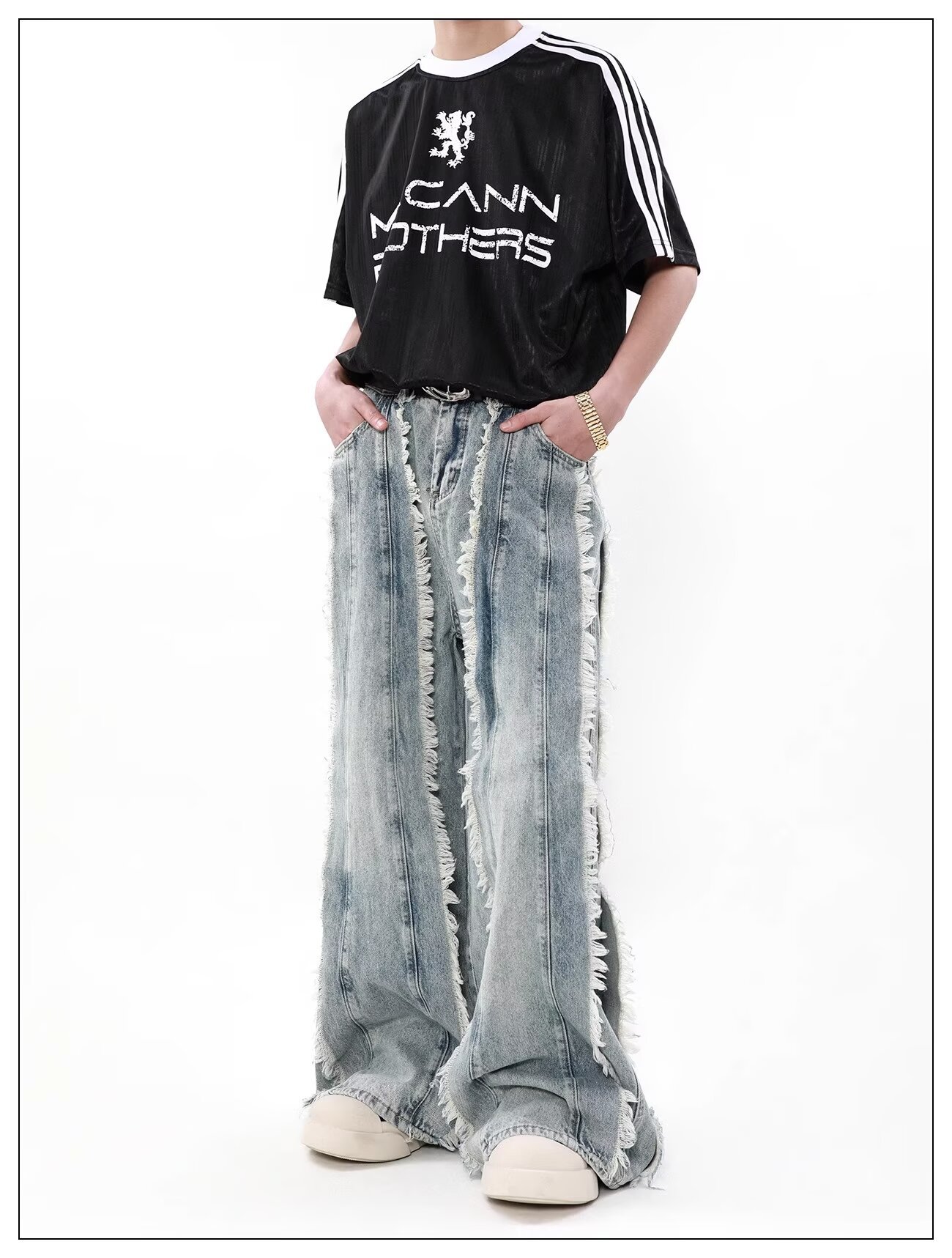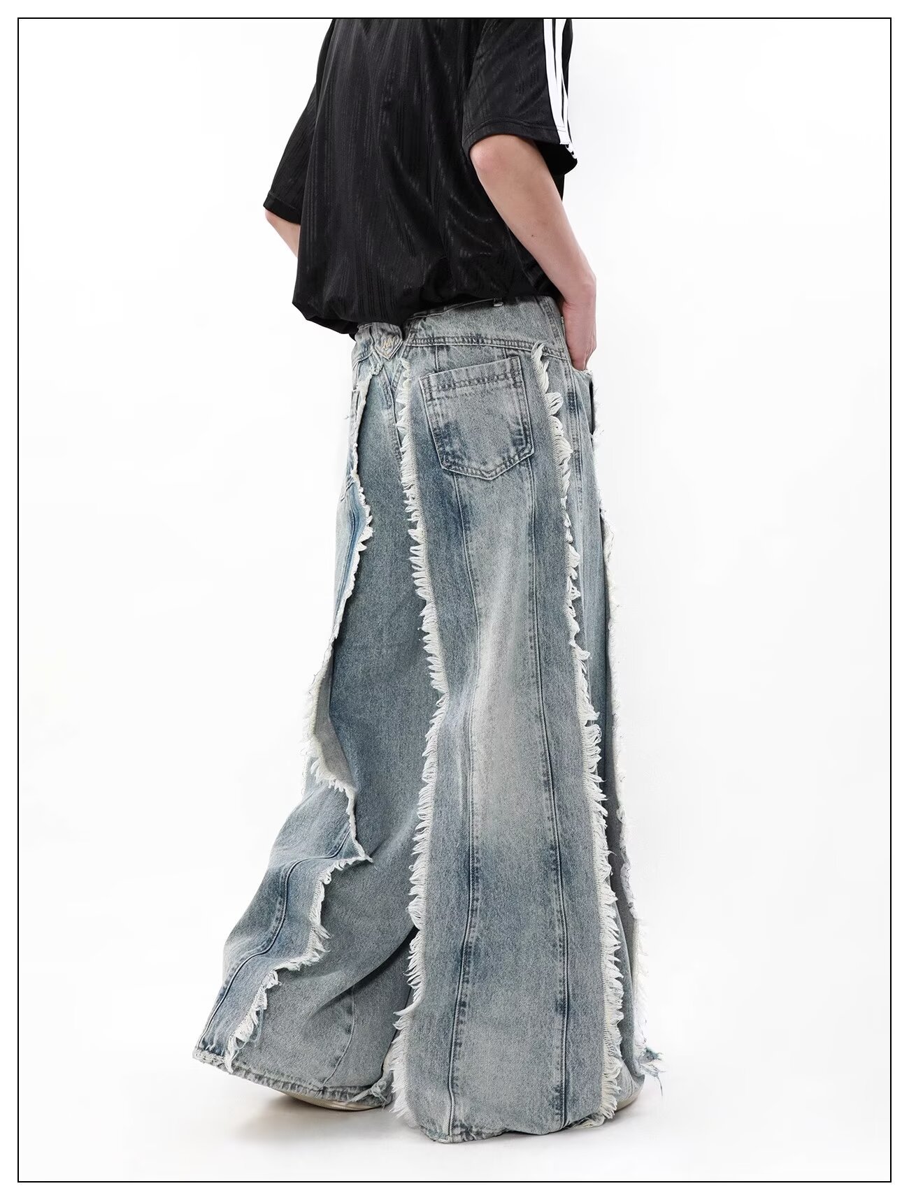 국경 간 폭발 미국 스타일 레트로 폐기물 토양 스타일 술 스티칭 디자인 센스 청바지 남성 틈새 느슨한 와이드 레그 트렌디 바지