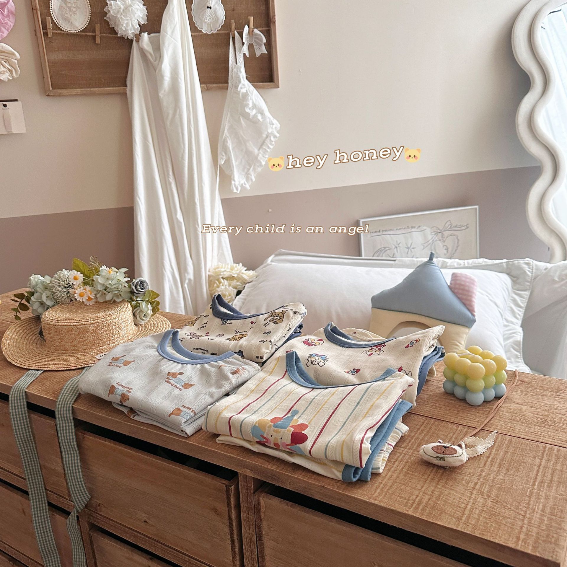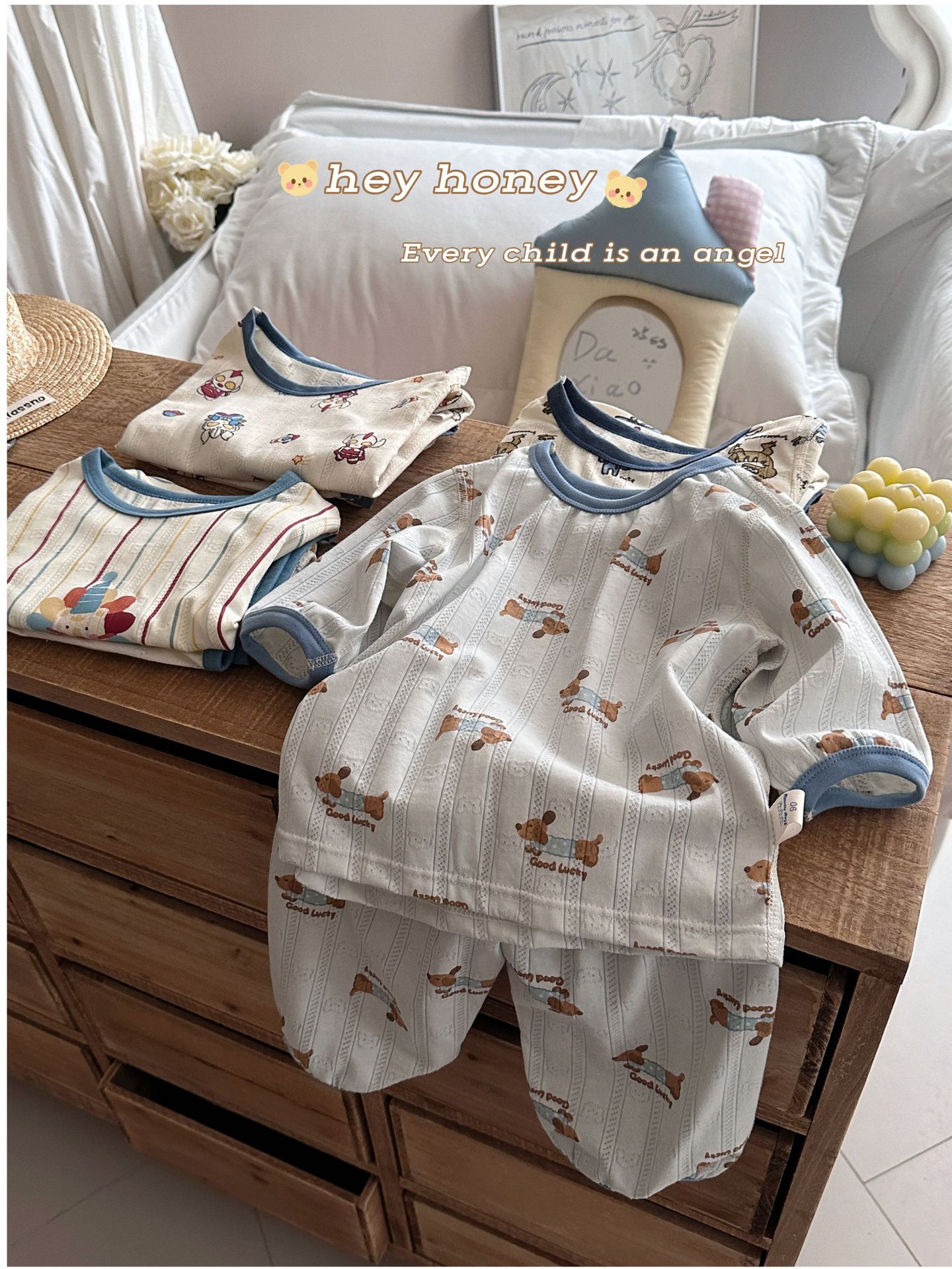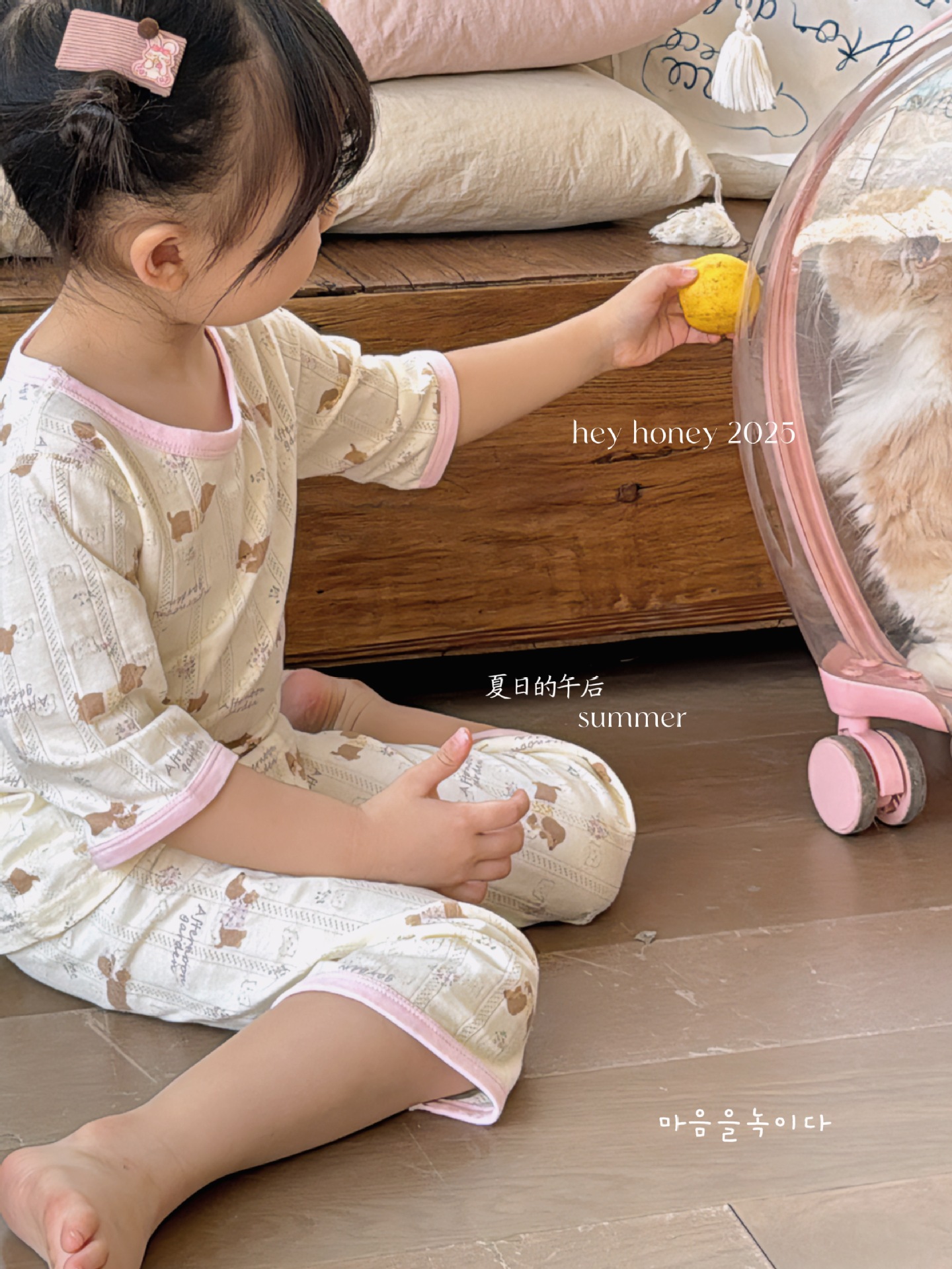 재고 있음 Hey Sweetheart 사이즈 롤 25 여름 신작 어린이 반팔 호흡 구멍 만화 투피스 홈웨어 잠옷
