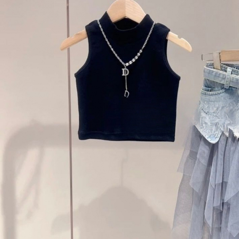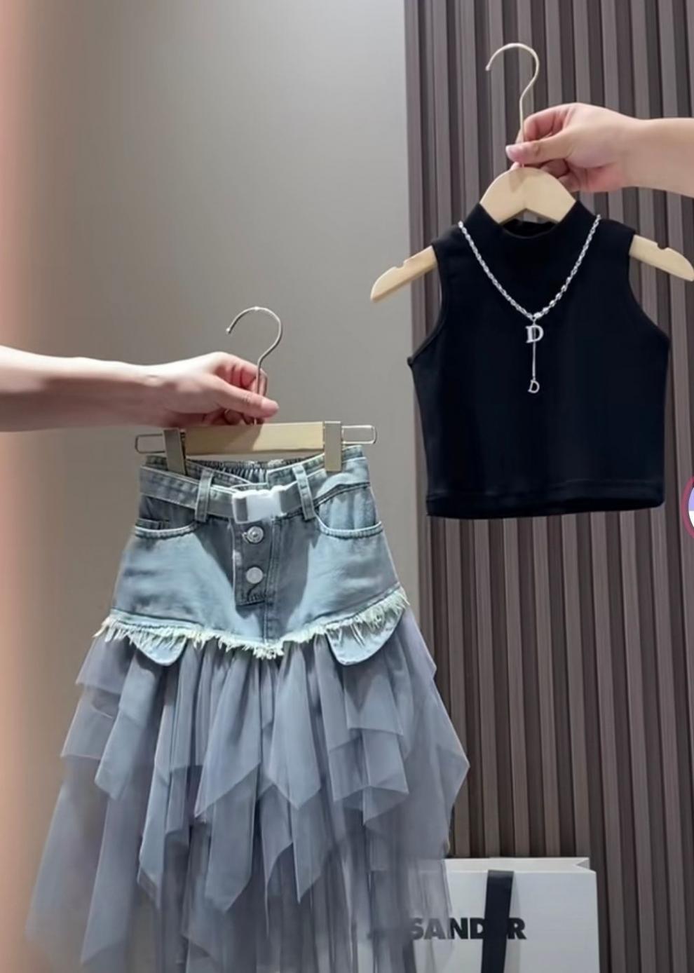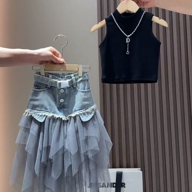 여자 여름 새 도착 세트 2025 한국식 외국식 아기 민소매 조끼 인터넷 인기 메쉬 스티칭 데님 스커트 트렌디스토어 가기
