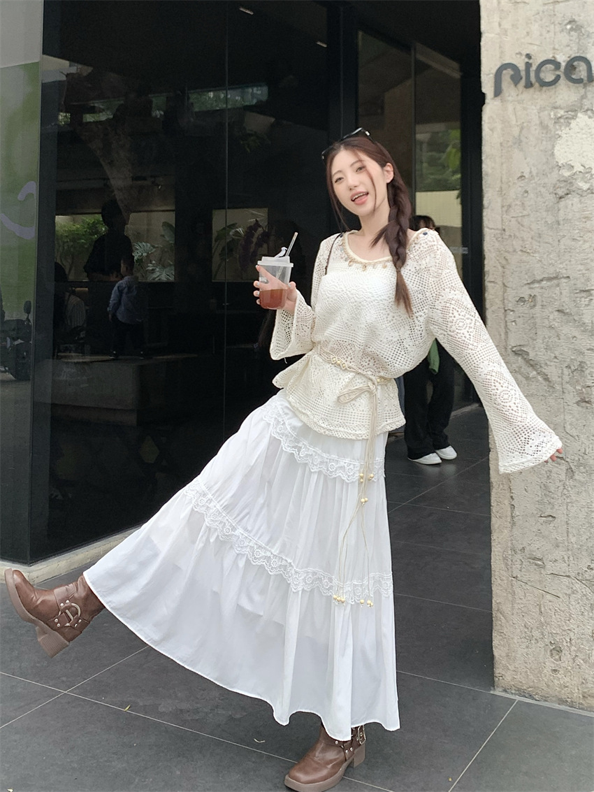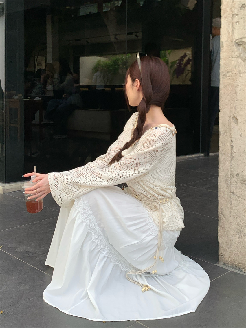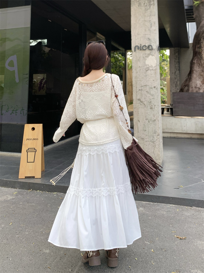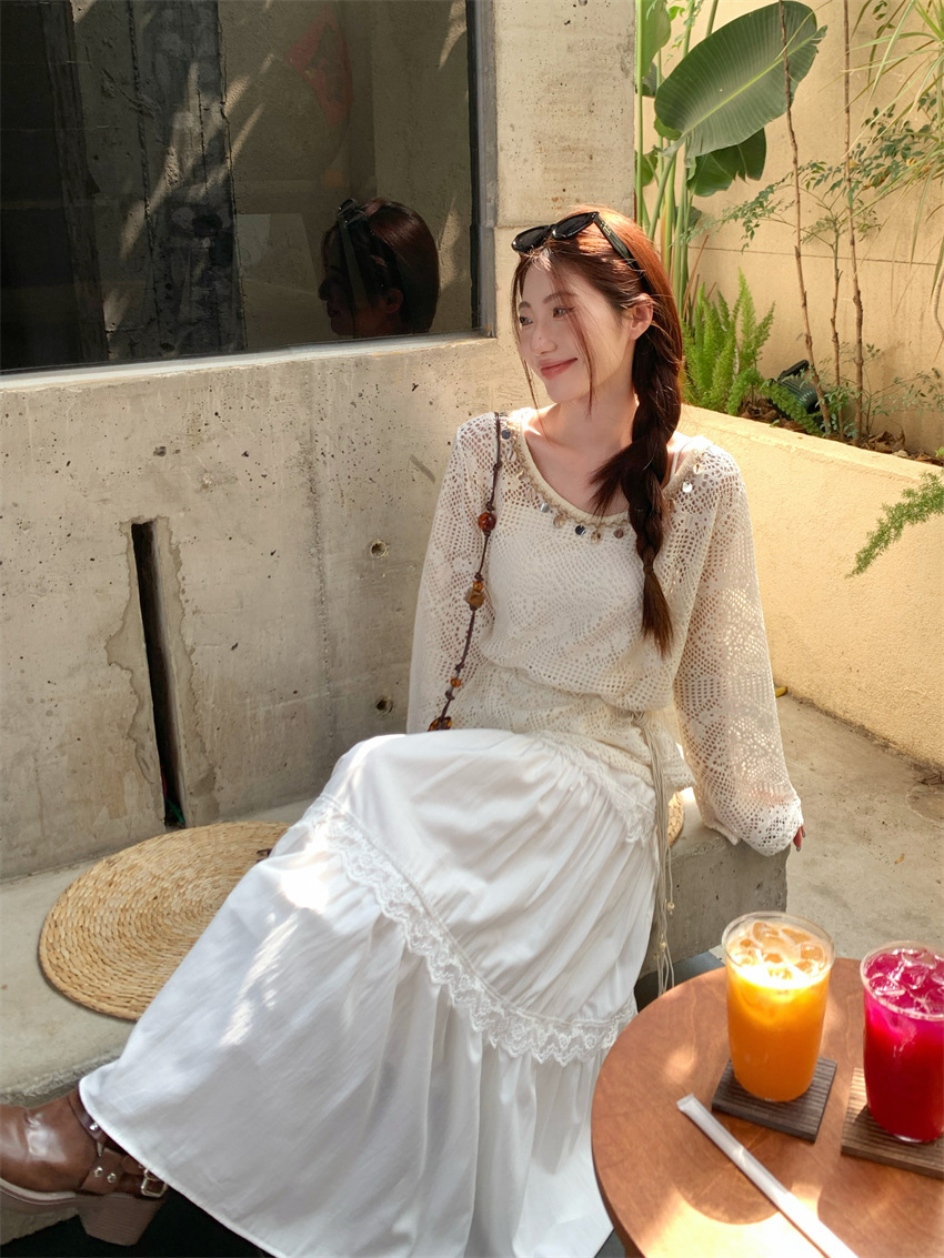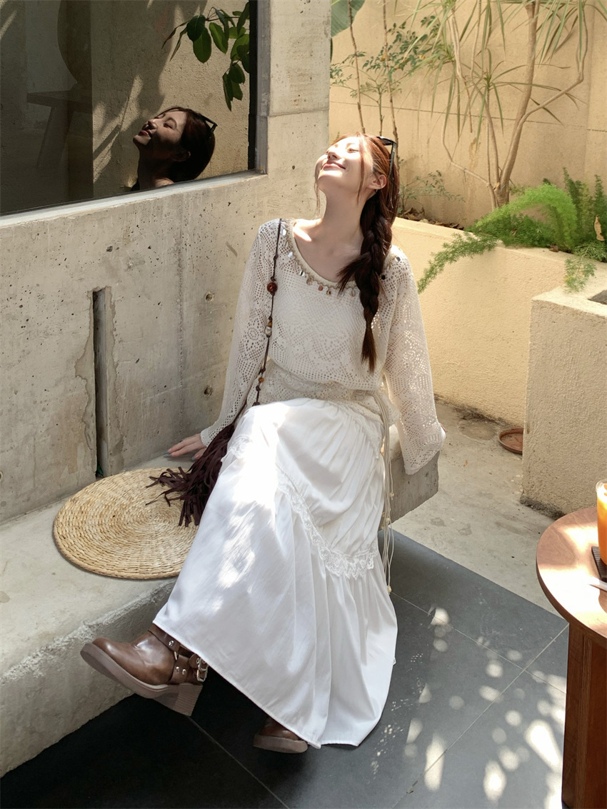 로맨틱 화이트 스커트 세트 78966 으로 속이 빈 니트 블라우스를 착용 한 실제 샷 휴일 분위기 느낌