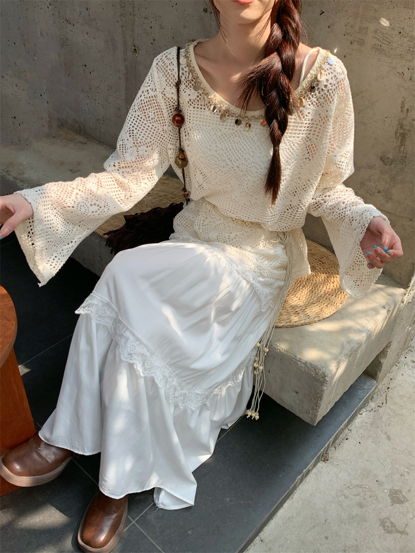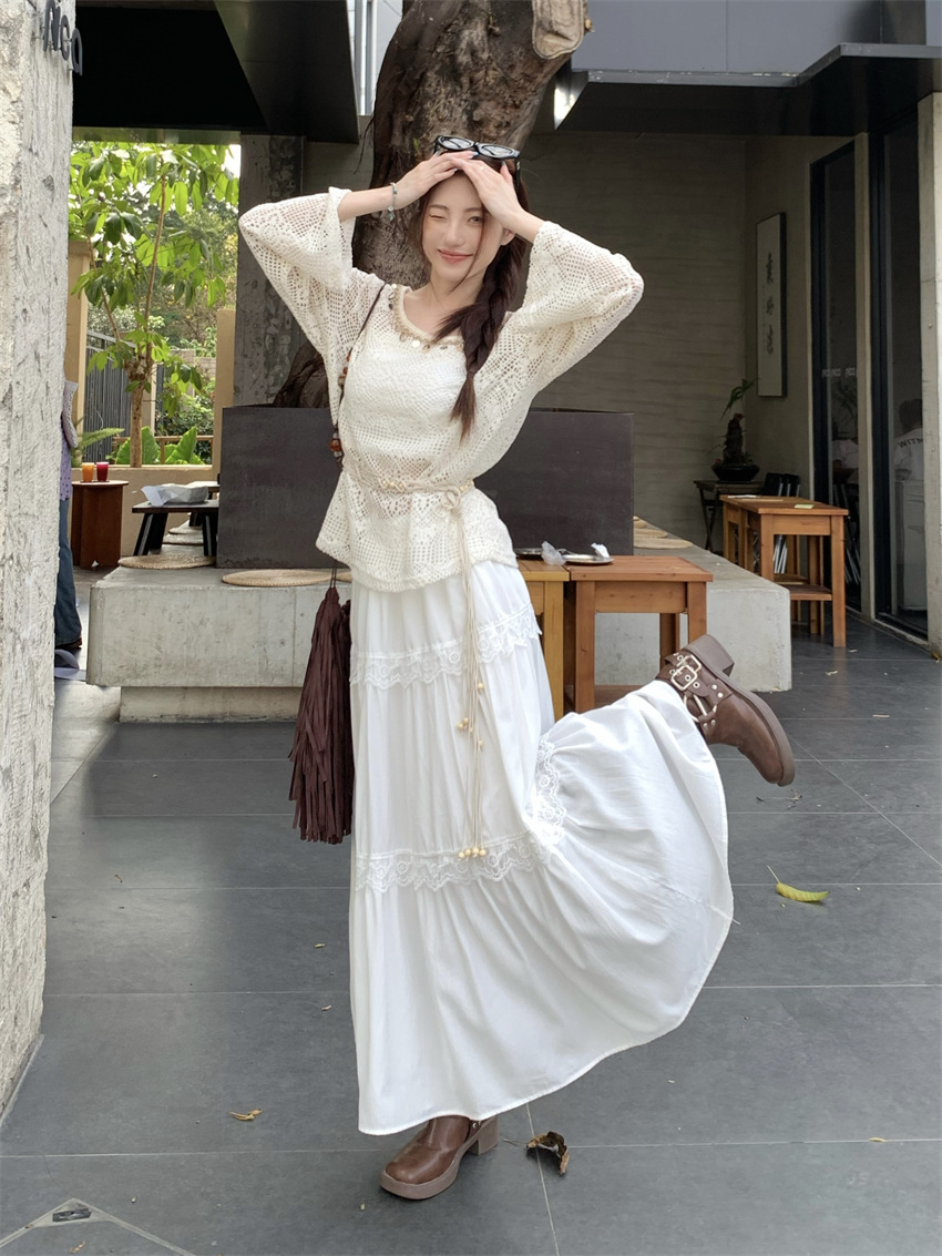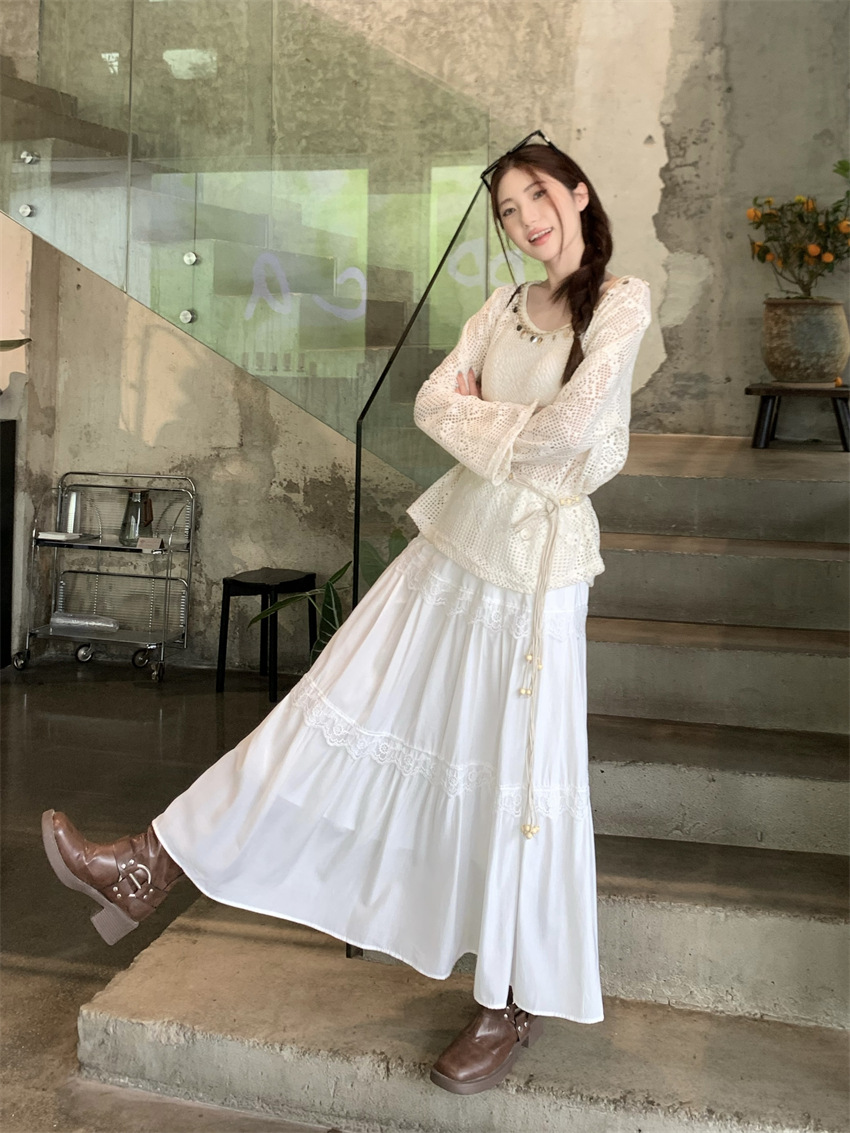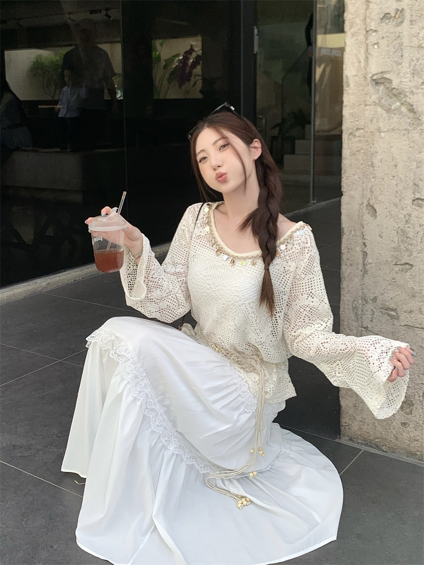 로맨틱 화이트 스커트 세트 78966 으로 속이 빈 니트 블라우스를 착용 한 실제 샷 휴일 분위기 느낌