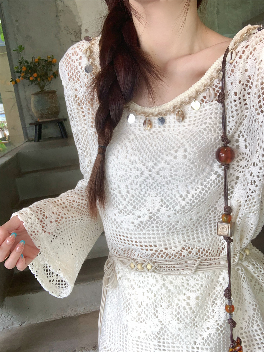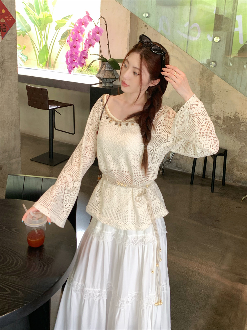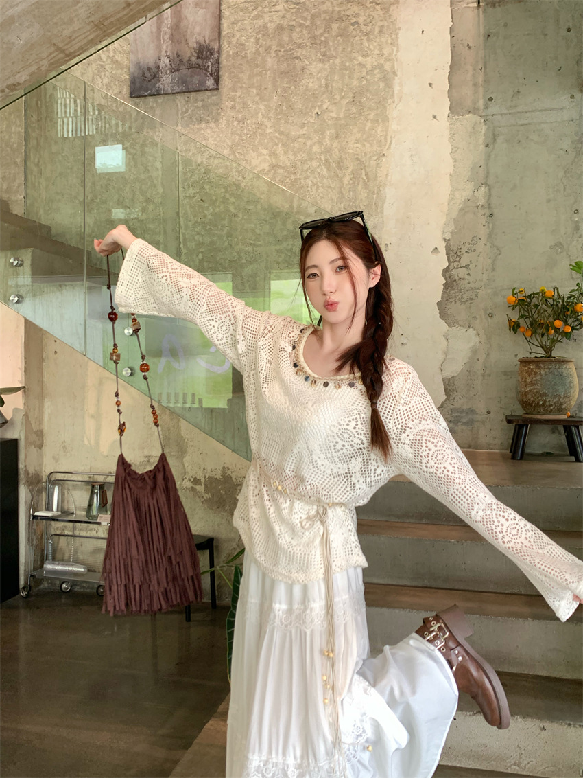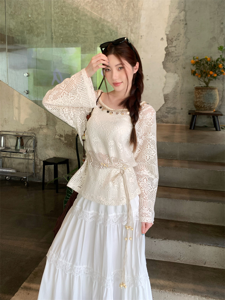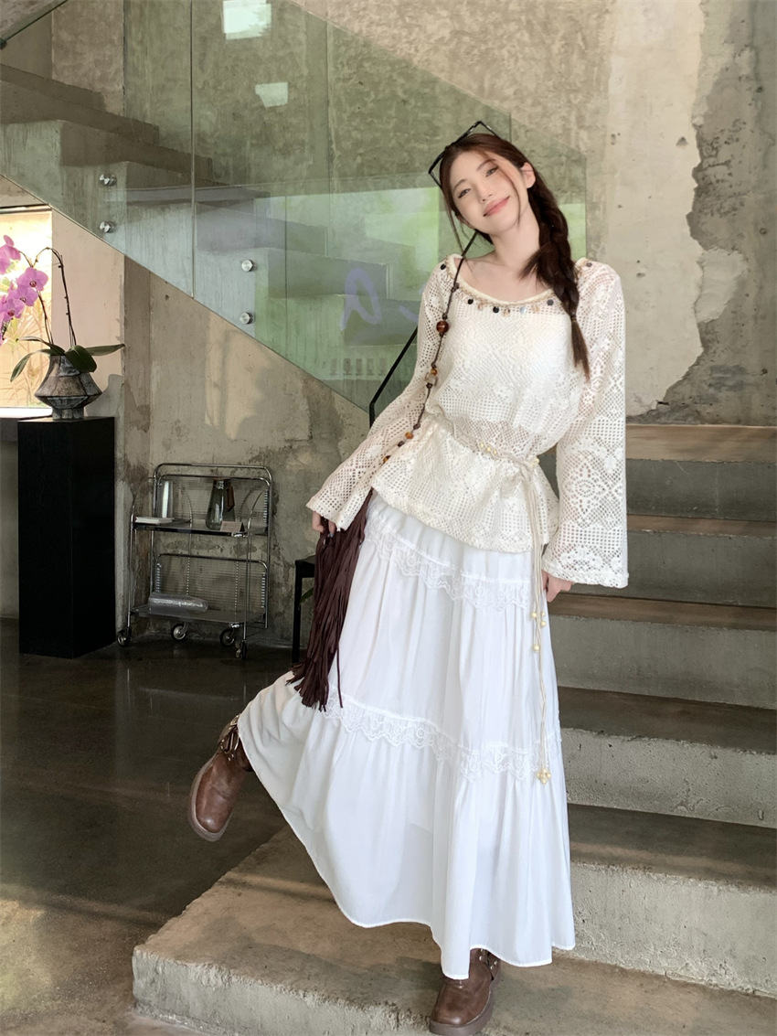 로맨틱 화이트 스커트 세트 78966 으로 속이 빈 니트 블라우스를 착용 한 실제 샷 휴일 분위기 느낌