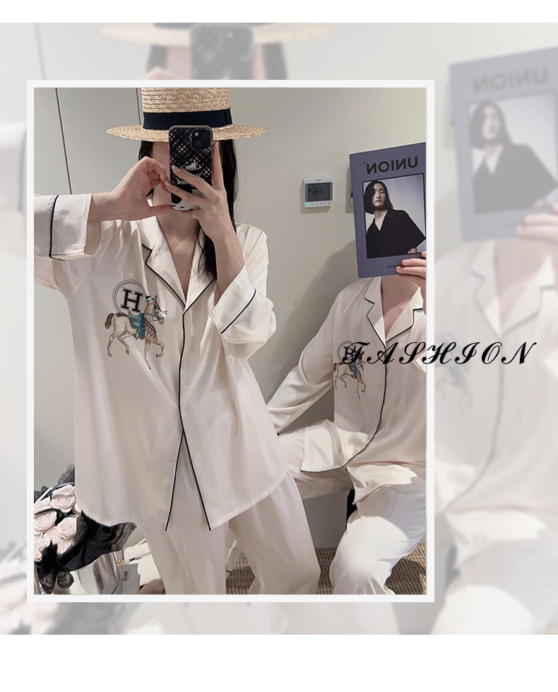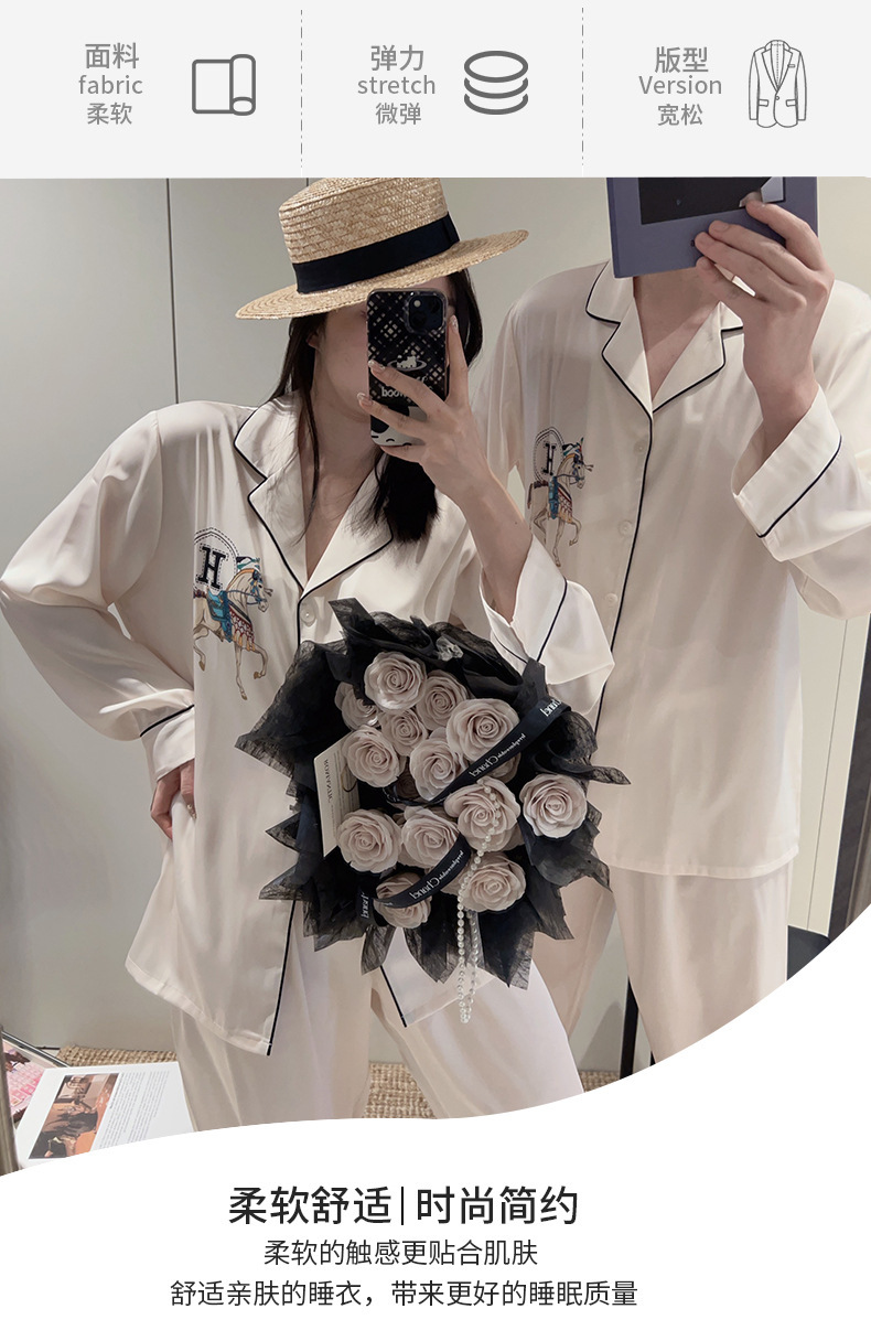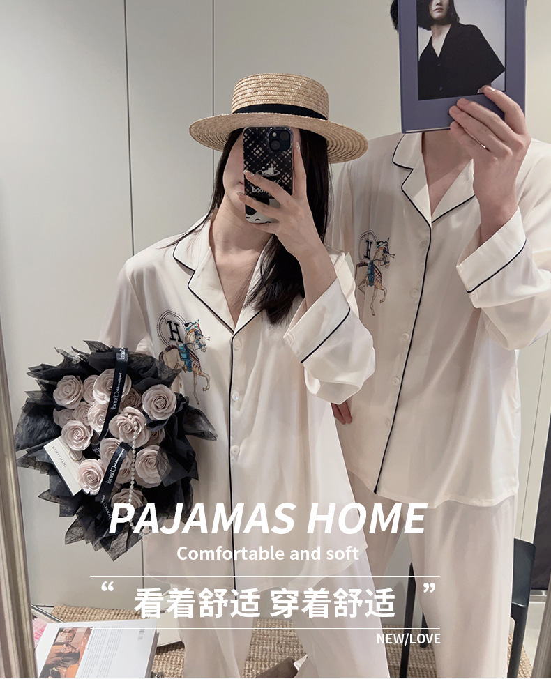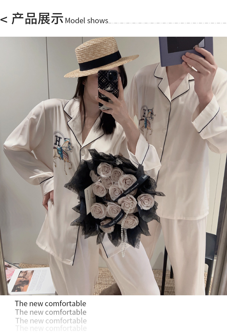 2025 남성과 여성을 위한 새로운 통기성 얼음 실크 커플 잠옷, 가벼운 고급 긴팔 바지, 가정복, 2피스 세트, 야외에서 착용 가능스토어 가기