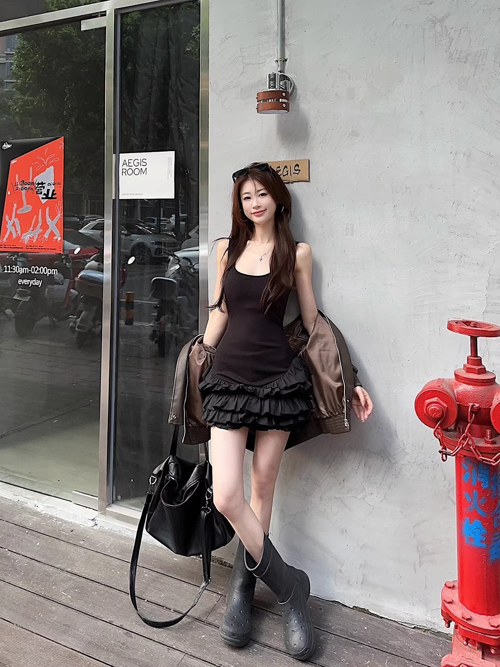 2025新款夏季黑色方领辣妹连衣裙赫本风小众miu系修身收腰花苞裙