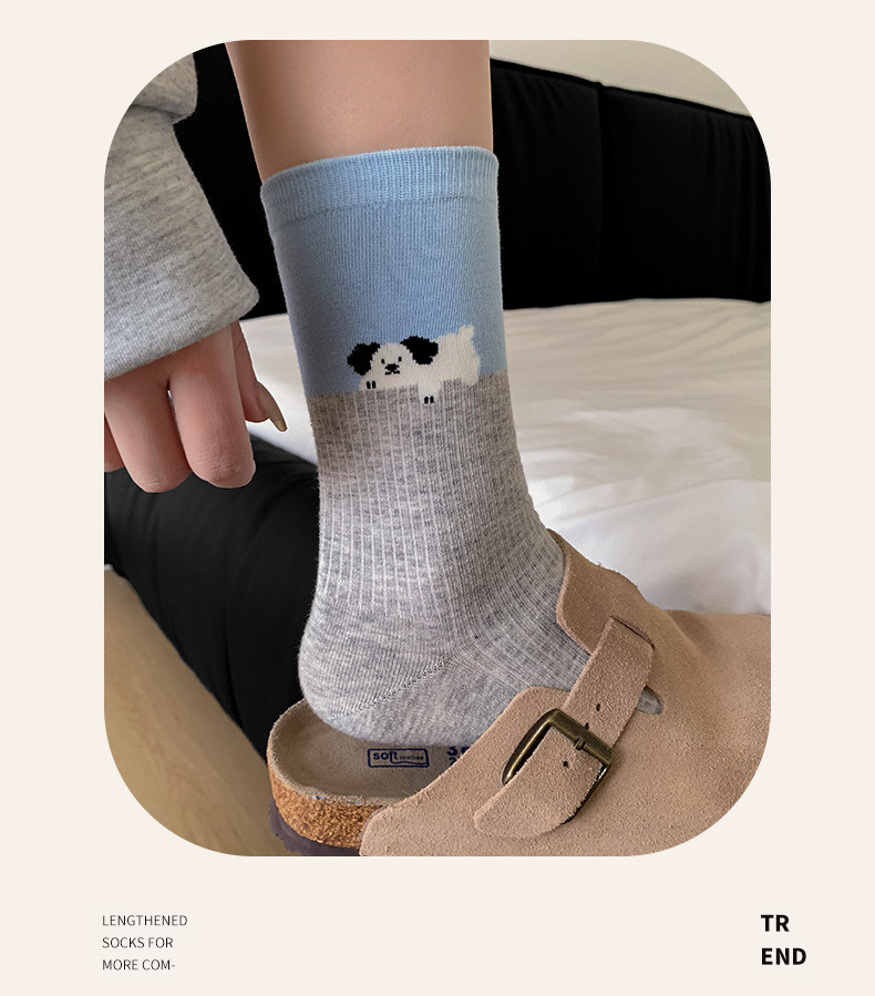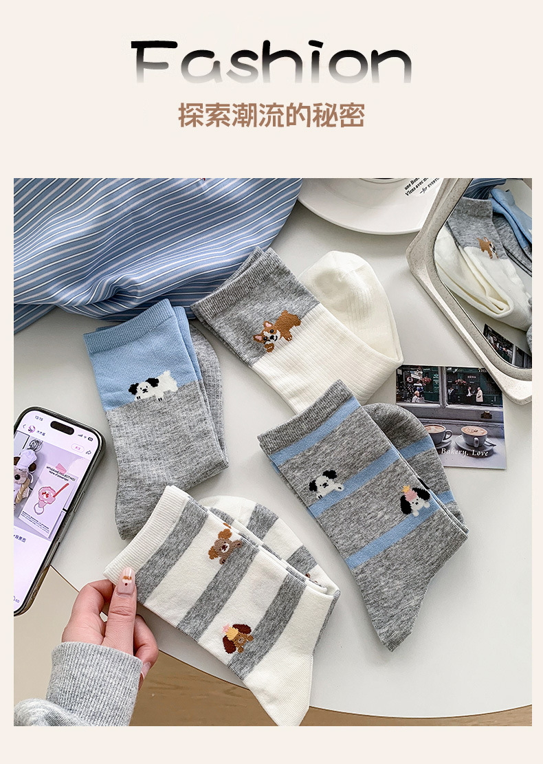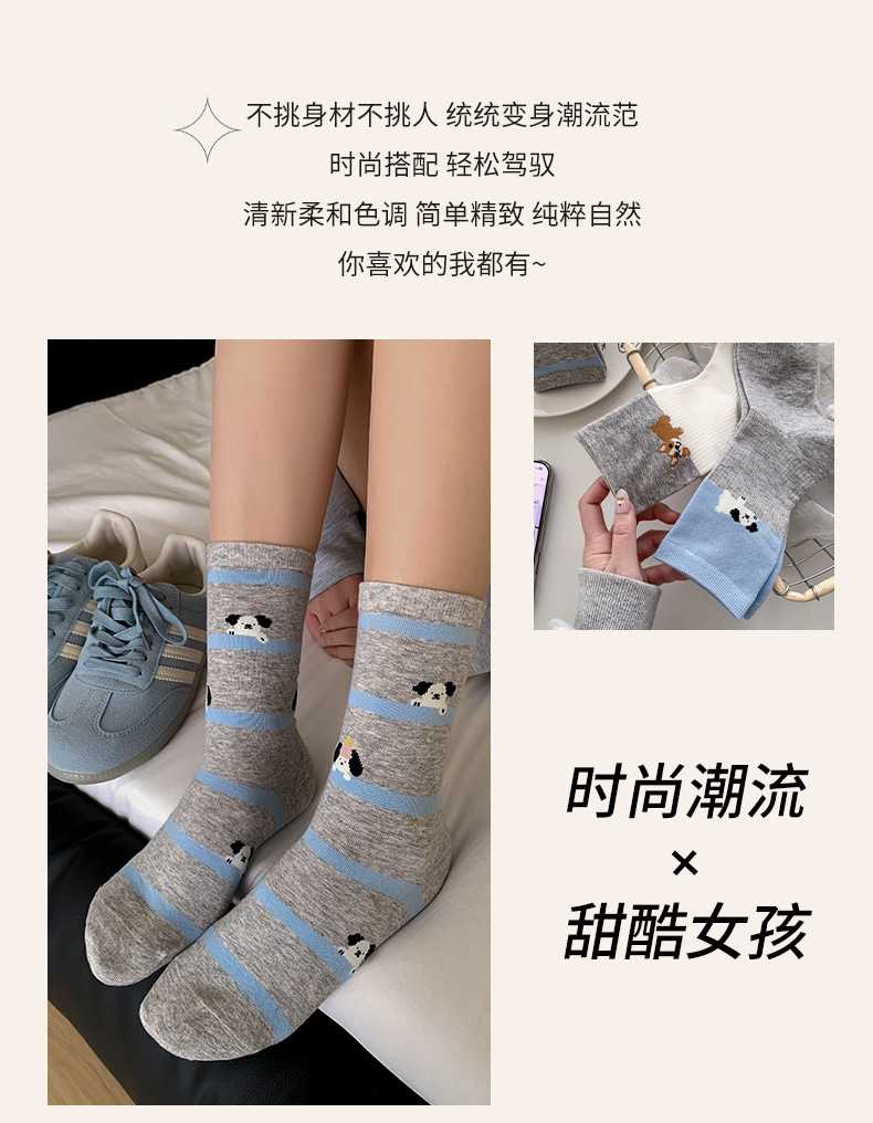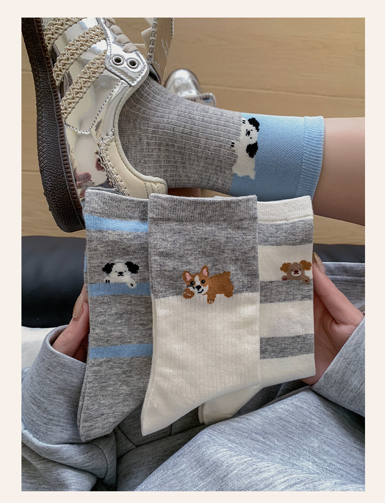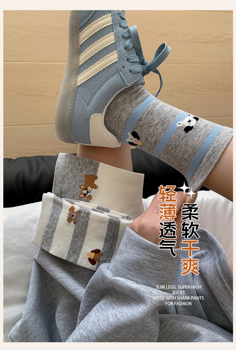 블루 그레이 양말 여성 봄과 여름 새로운 대학 스타일 스트라이프 미드 튜브 양말 만화 강아지 스택 양말 땀 흡수 뼈없는 양말