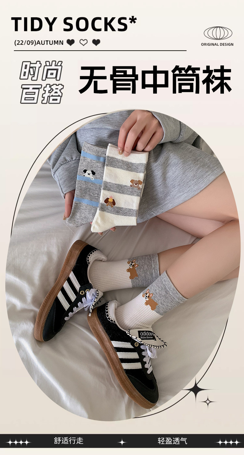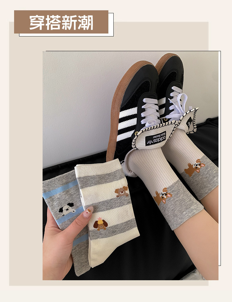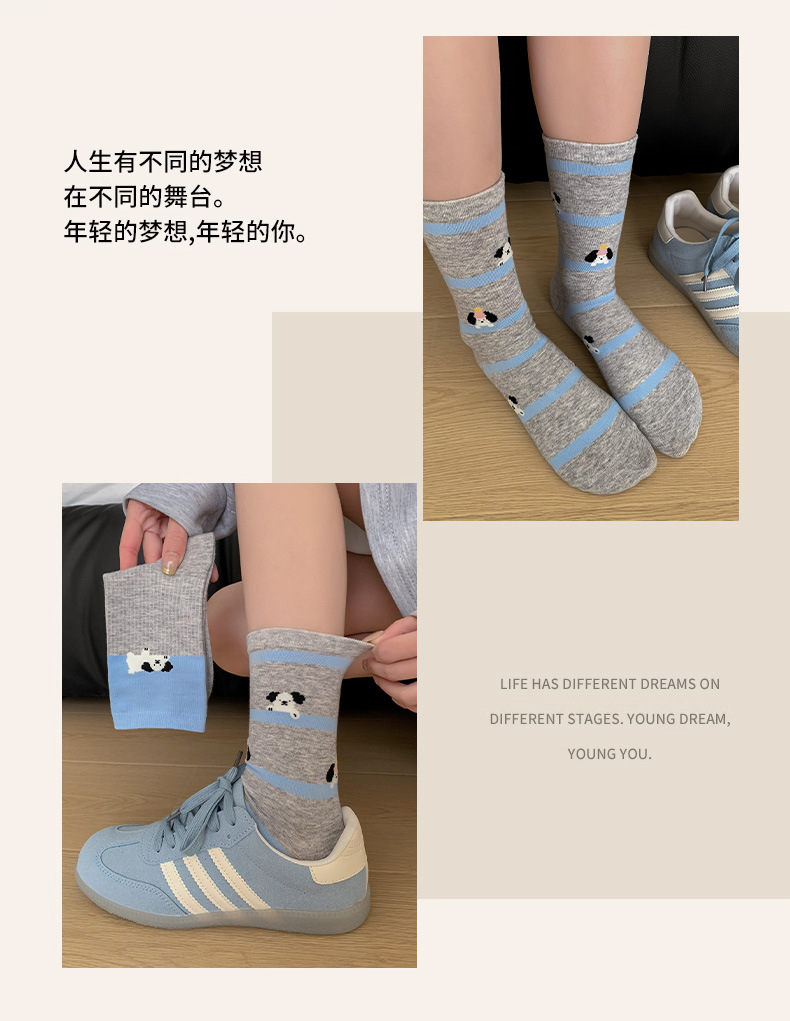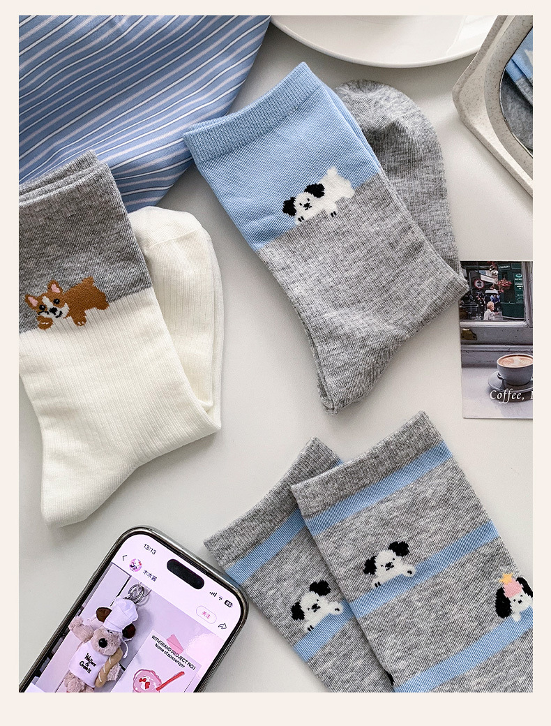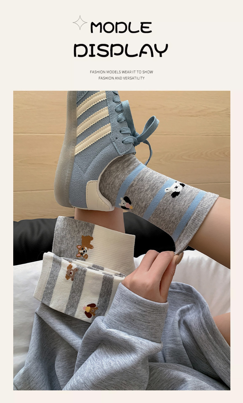 블루 그레이 양말 여성 봄과 여름 새로운 대학 스타일 스트라이프 미드 튜브 양말 만화 강아지 스택 양말 땀 흡수 뼈없는 양말