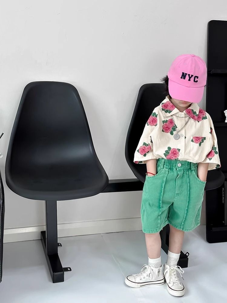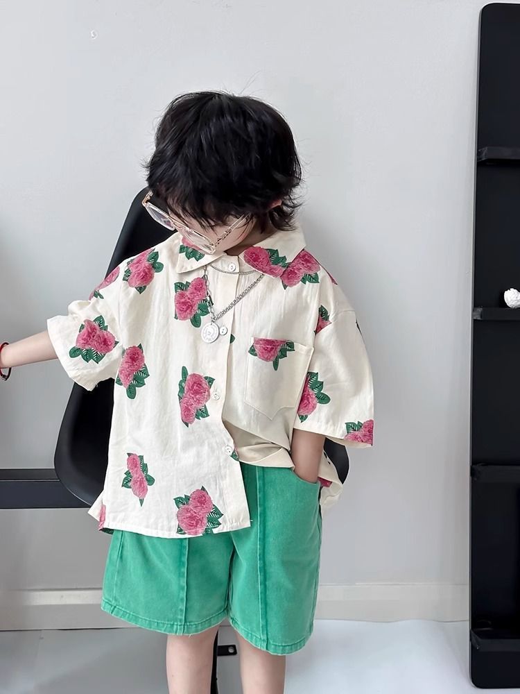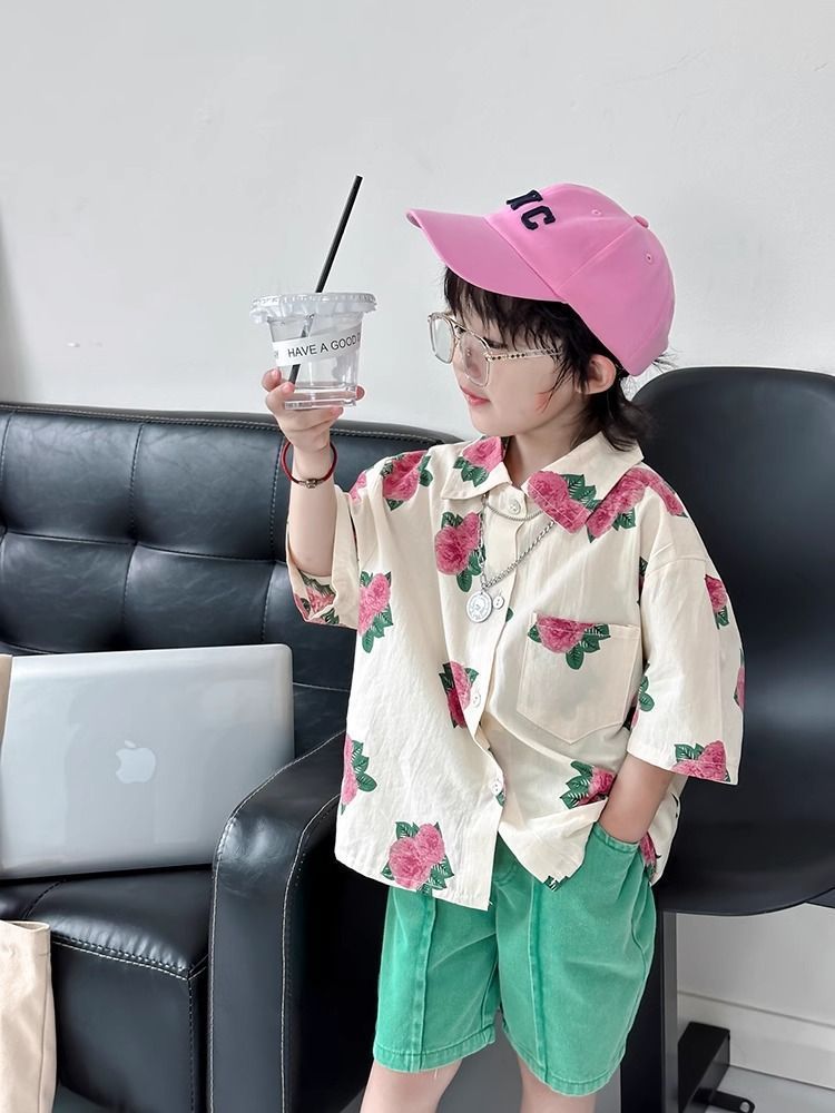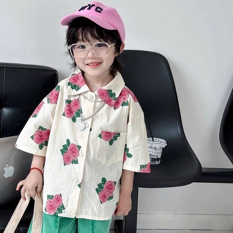 2025 년 여름 인쇄 된 반팔 셔츠 소년 소녀 한국 스타일 어린이 느슨한 모란 인쇄 셔츠 영국 스타일 카디건