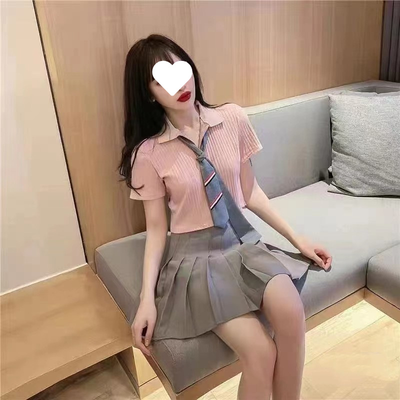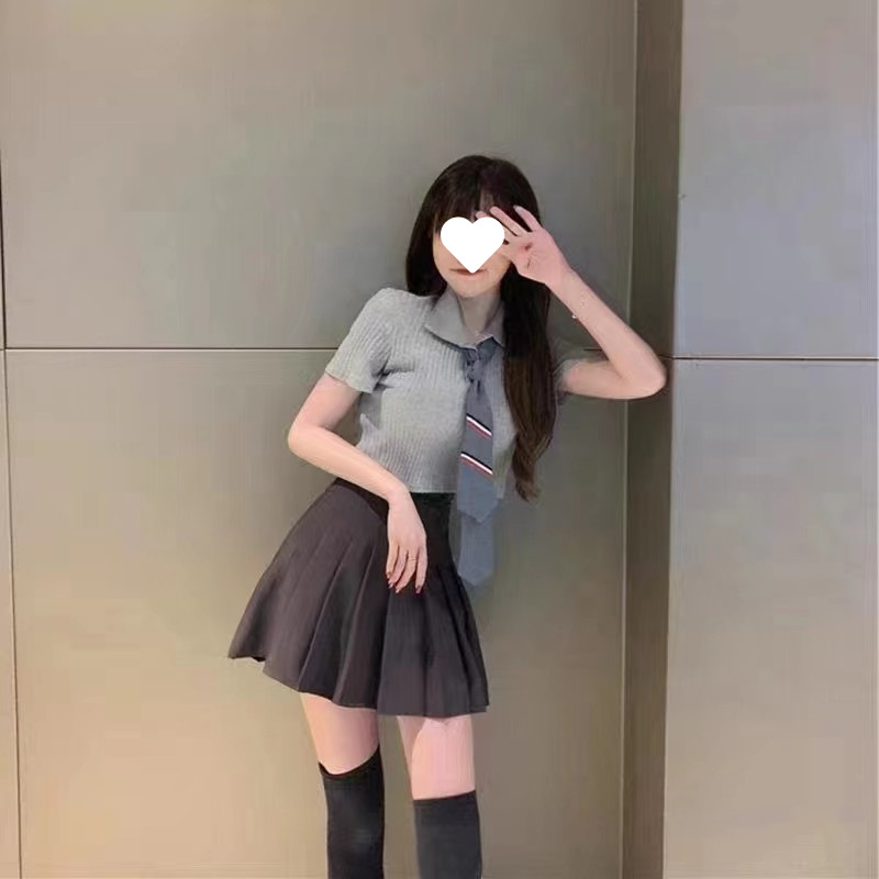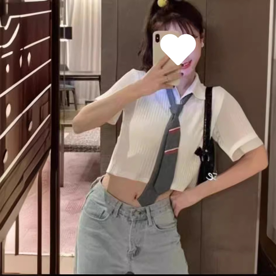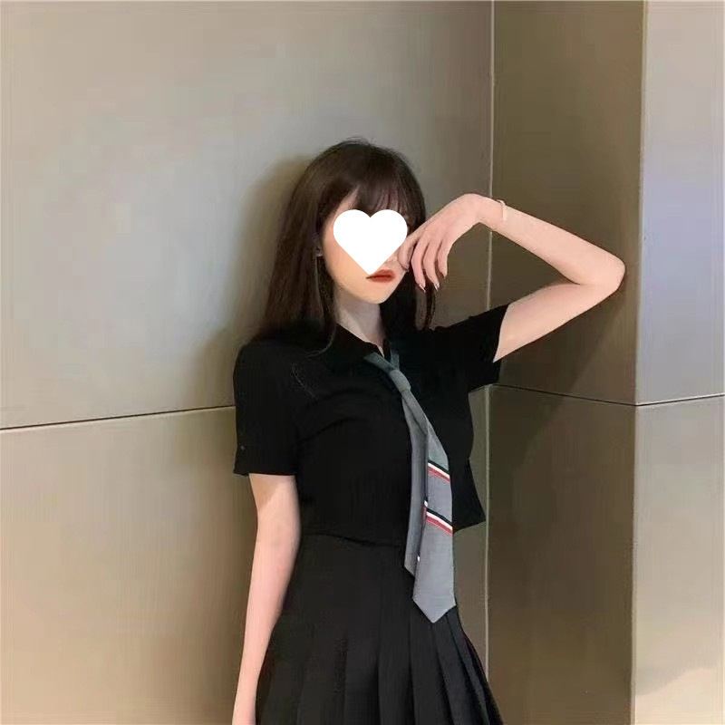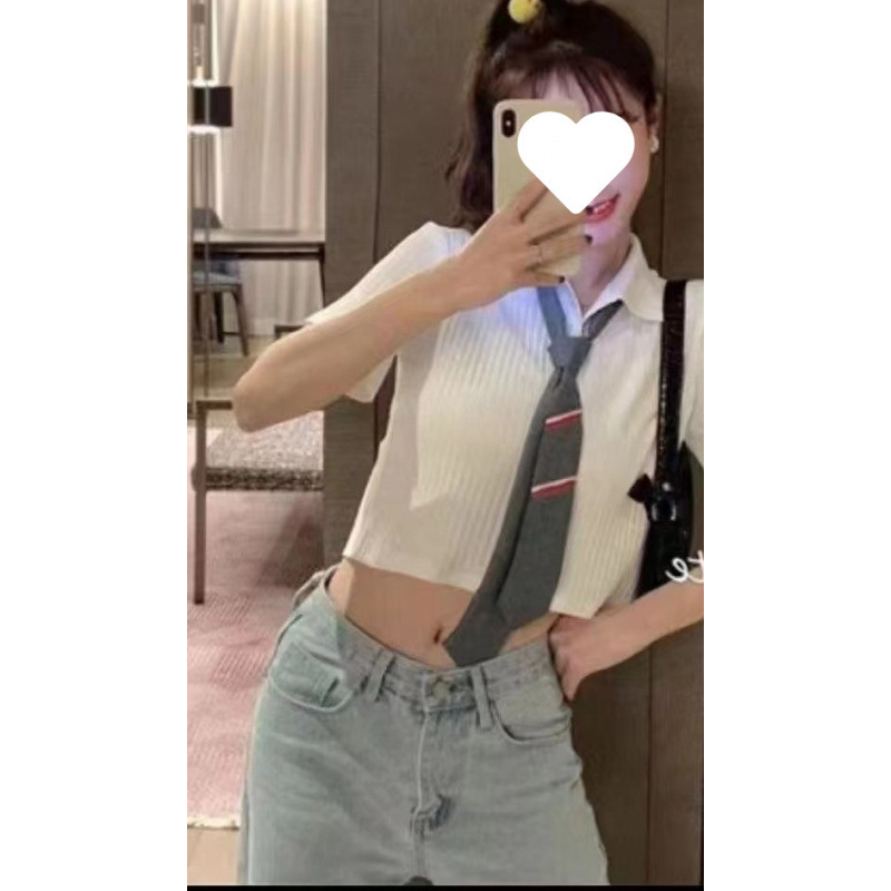 여름 새로운 한국 스타일 대학 스타일 옷깃 JK 넥타이 높은 허리 짧은 소매 섹시한 니트 셔츠 올 매치 최고 여성스토어 가기