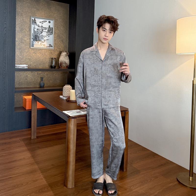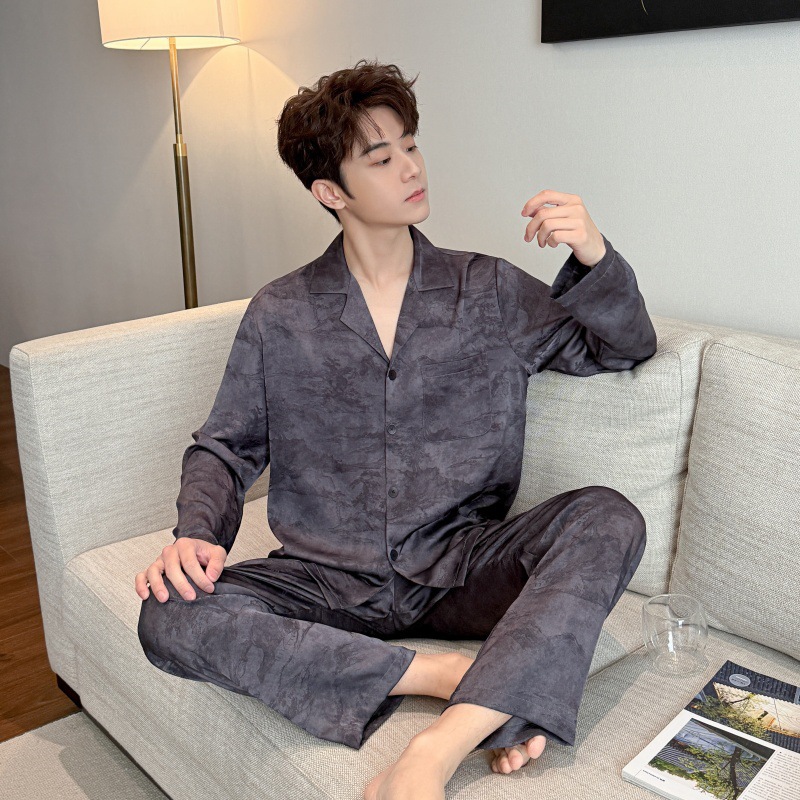 봄, 가을 남성 잠옷, 아이스 실크 얇은 양복, 고급스럽고 가벼운 럭셔리 홈웨어, 대형 사이즈, 홈웨어 외부 착용 가능