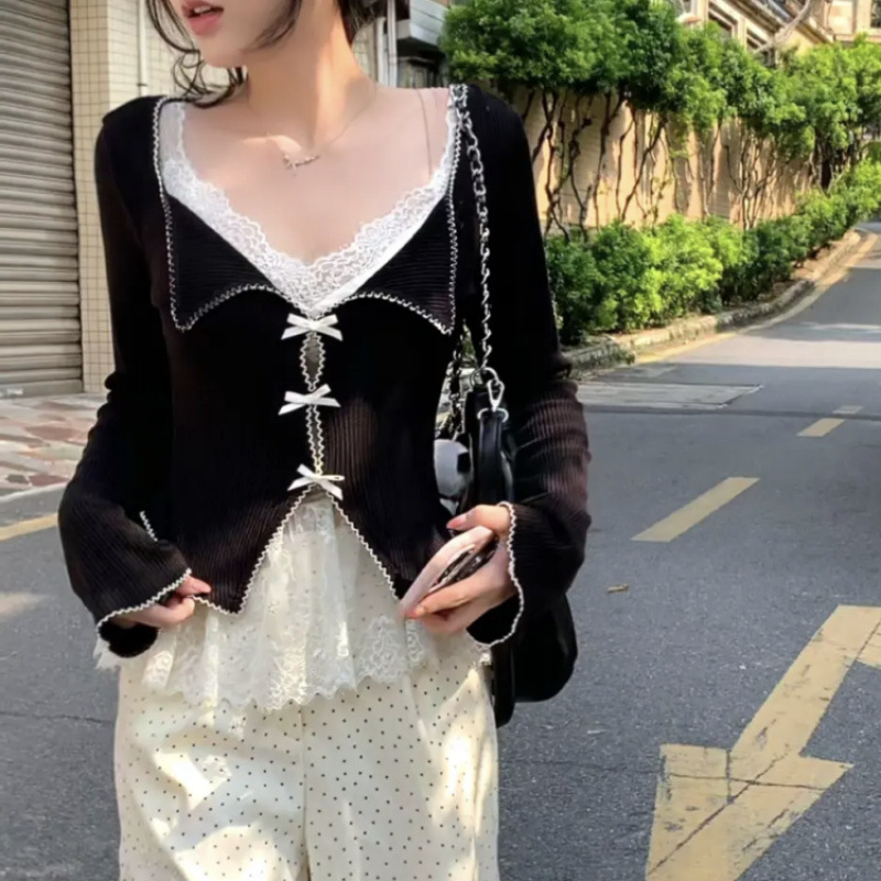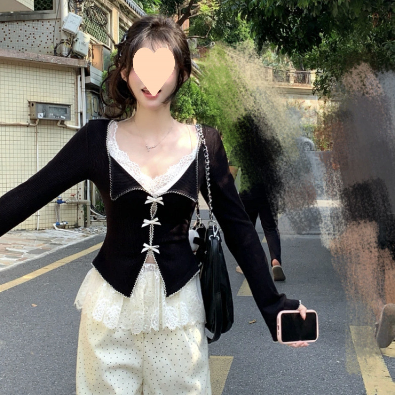 스파이스 걸스 세트 활 긴팔 니트웨어 여성용 이른 봄 레이스 카미솔 캐주얼 웨이브 도트 바지스토어 가기