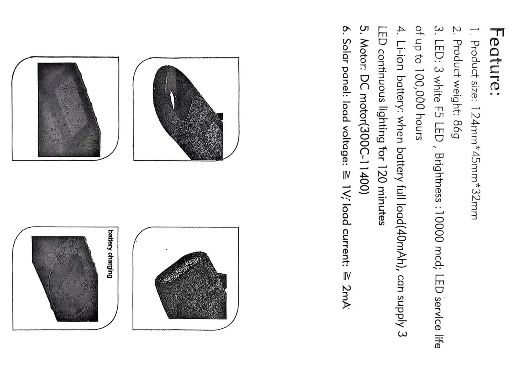 3.电机:直流(300C-11400),20.4W,15流明值4.电池:一字型镍氢电池3.6V-80mAh;管亮120分钟
