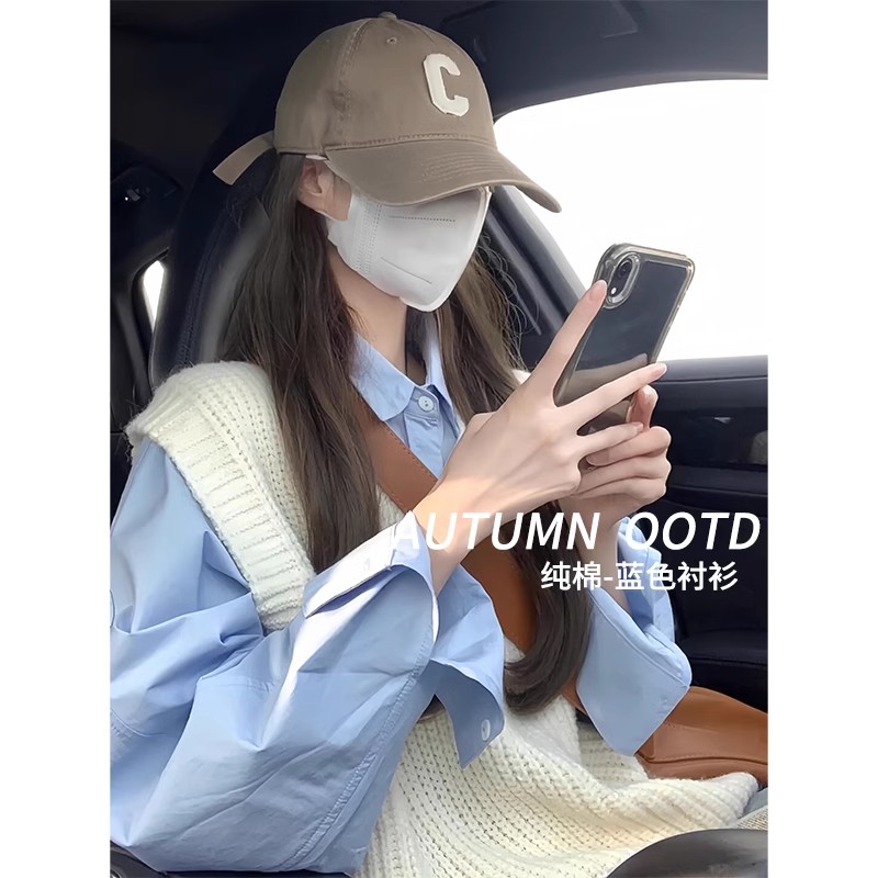 한국 스타일 블루 코튼 셔츠 여성 봄과 가을 2025 새로운 스타일 우아한 내복 작은 외모 어깨 긴 소매 탑스토어 가기