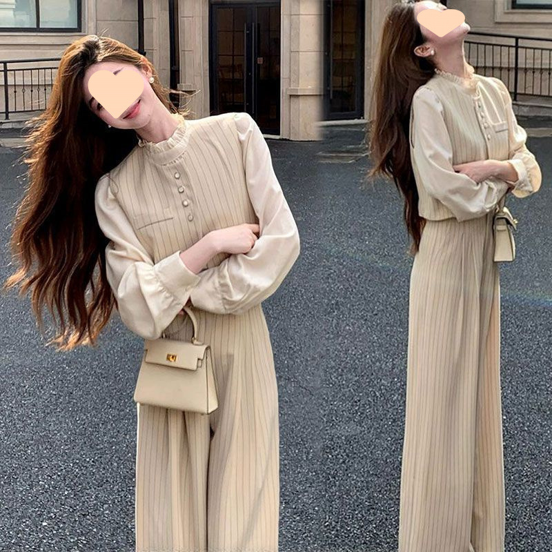 싱글/세트 빈티지 스트레이트 라운드 넥 스트라이프 조끼 여성 가을 느슨한 넓은 다리 캐주얼 바지 슬리밍 투피스 유행 세트스토어 가기