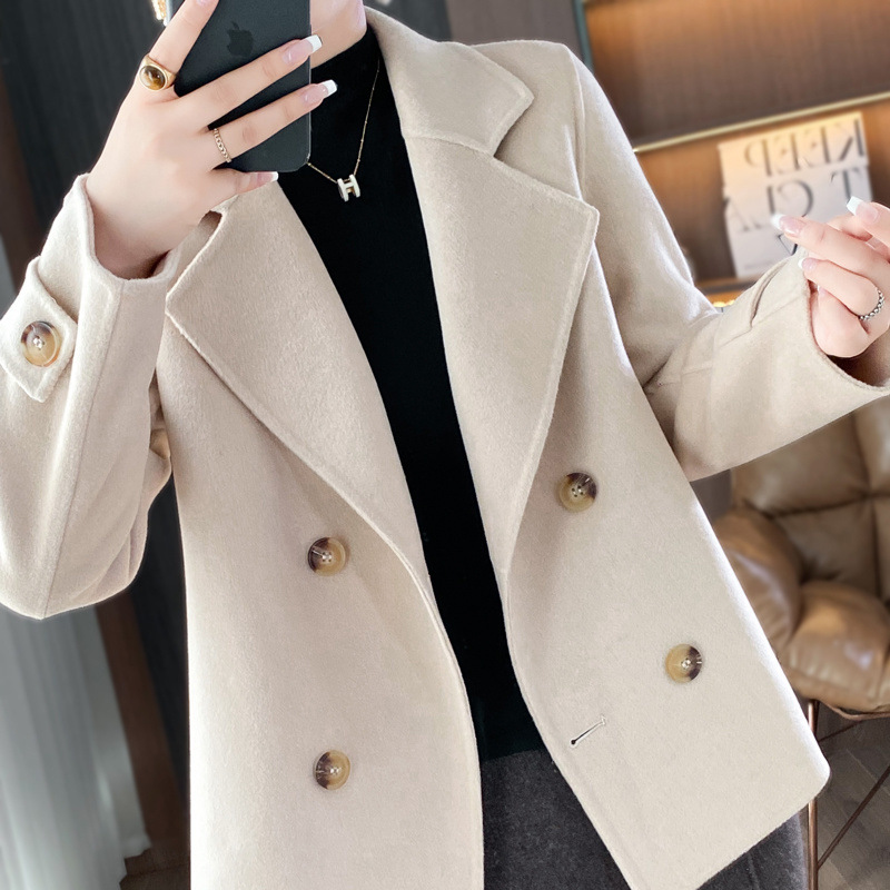 • 카멜 스타일의 사이드 포켓 ​​쇼트 더블 브레스티드 코트