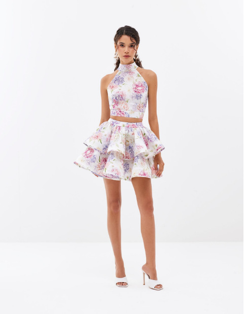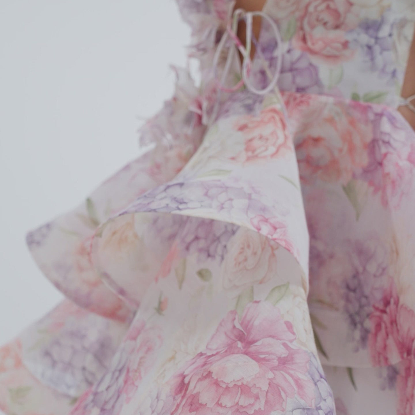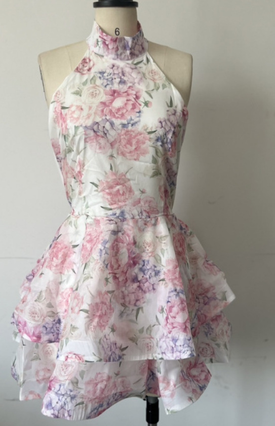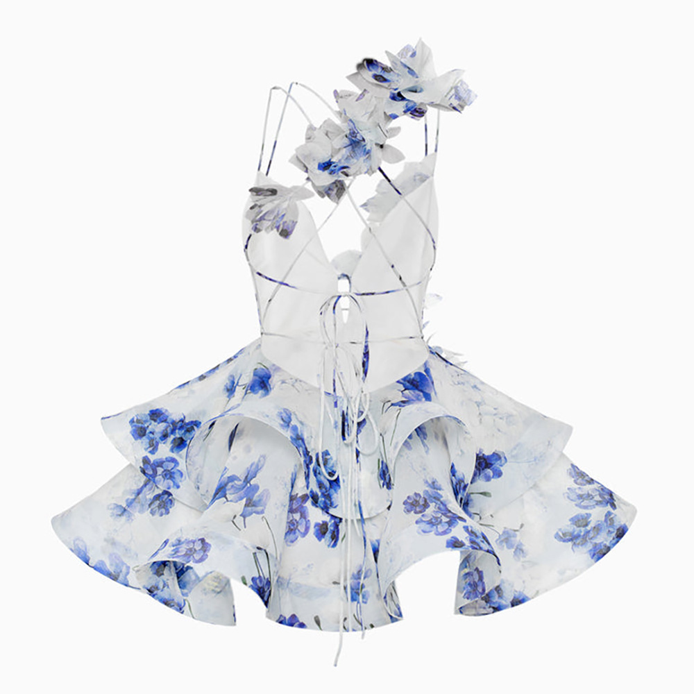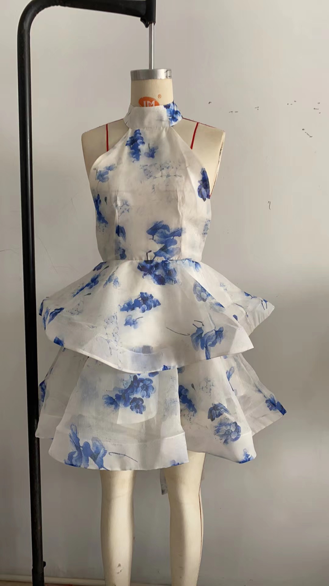 欧美碎花印花修身V领花苞裙摆连衣裙无袖吊带露背短裙时尚度假风