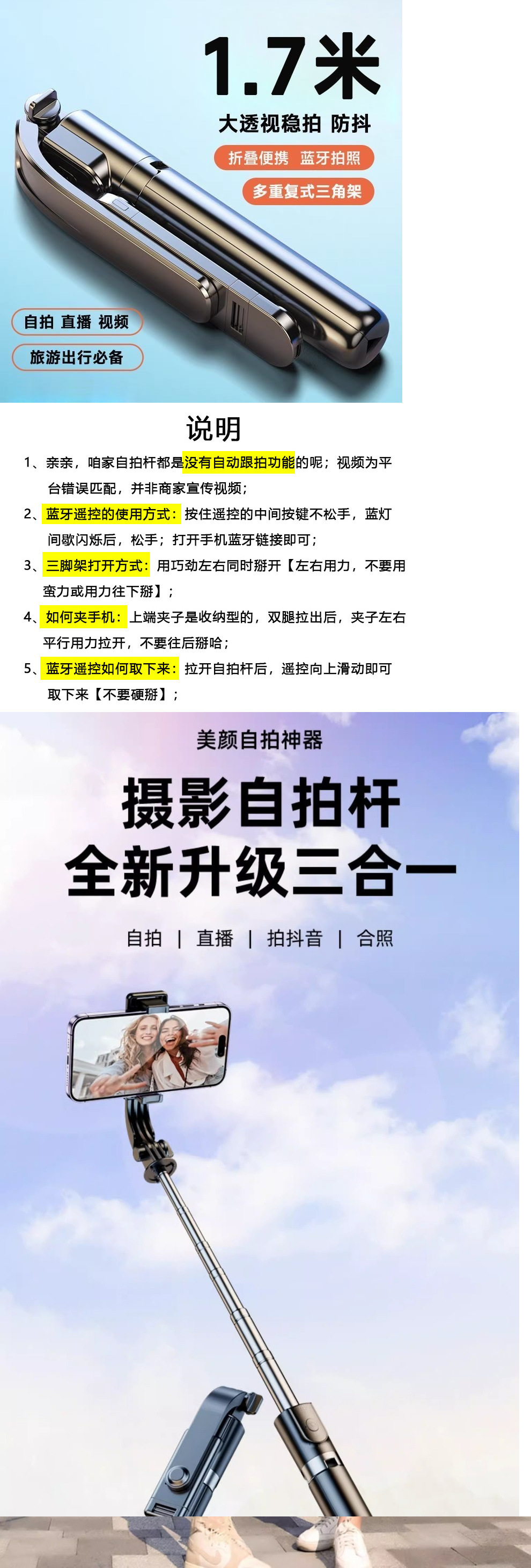 • [다크나이트 블랙] 일체형 폴딩-[1.7m 확장 버전] 가로 및 세로 촬영 + 블루투스 리모컨 + 강화된 손떨림 방지