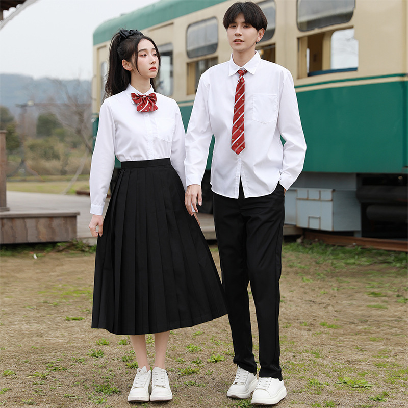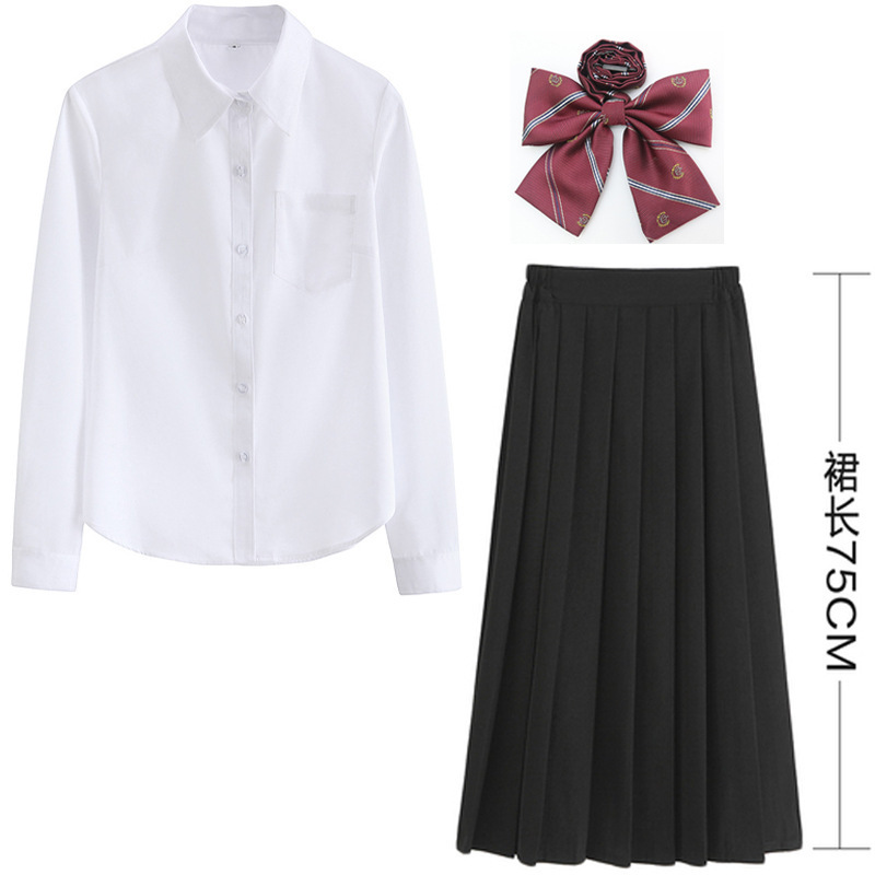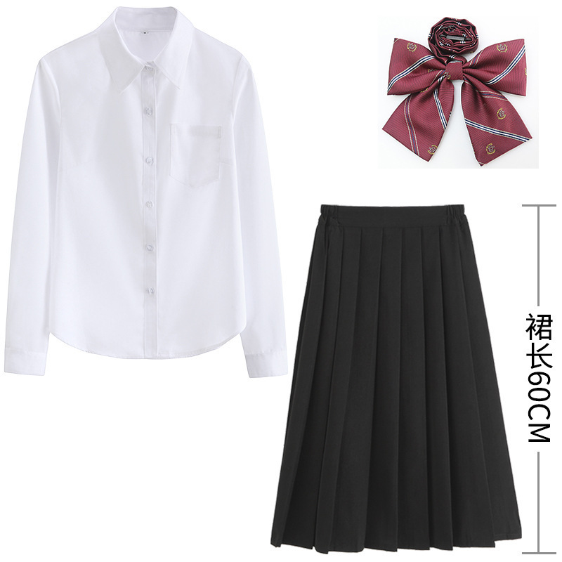 • 여아 긴팔 셔츠 + 검정색 롱 스커트 + 빨간색 왕관 넥타이
