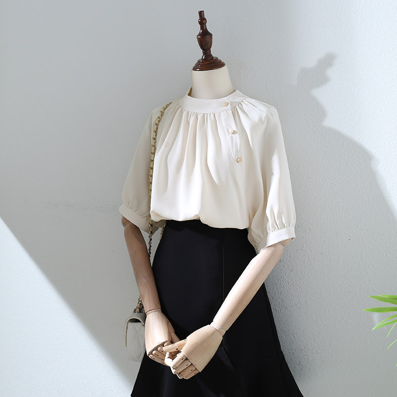 경사 버튼 새틴 쉬폰 셔츠 여성의 2024 년 봄과 가을 새로운 복고풍 작은 스탠드 칼라 디자인 틈새 세련된 탑
