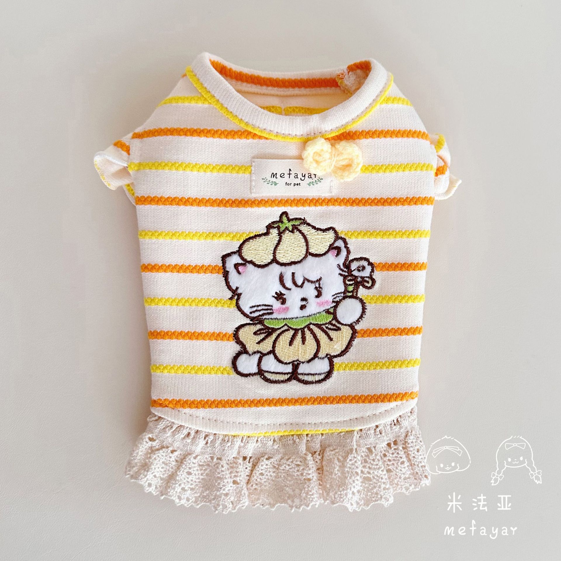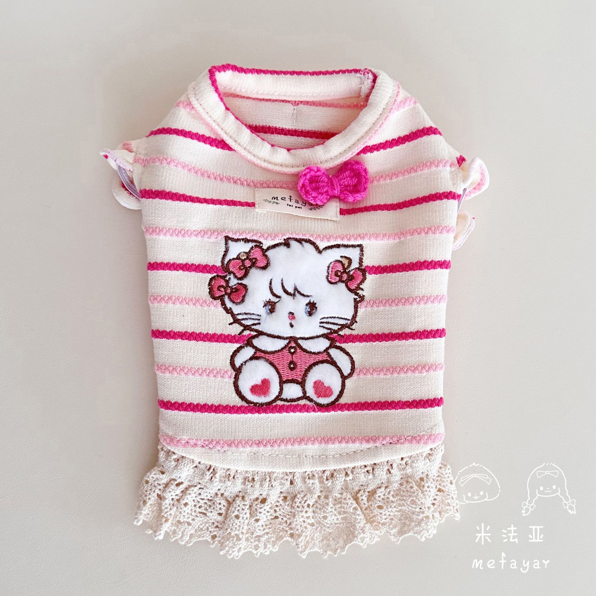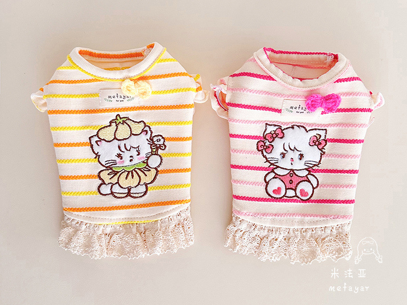 Mifaya 애완 동물 고양이와 개 옷 봄과 여름 줄무늬 새끼 고양이 만화 자수 면 레이스 활 공주 원피스스토어 가기