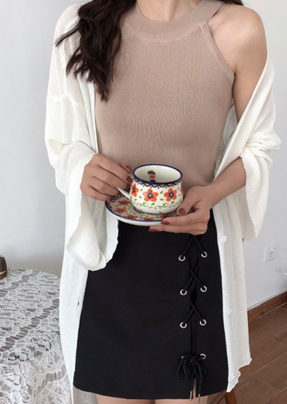 슬링 여성의 여름 짧은 니트 외부와 블랙 니트 넥 조끼 간단한 민소매 기본 셔츠 최고 트렌디