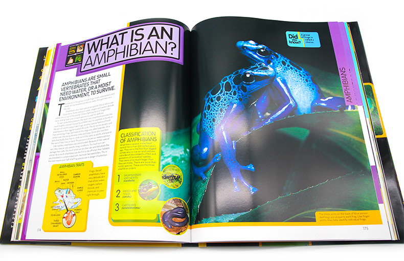 全书分为八个部份,介绍动物特点和各种类别的动物,比如:哺乳动物、鸟类、爬行动物、两栖动物、鱼类和无脊椎动物...等等。简单介绍搭配图片,极尽详细的介绍动物的身体构造和分类。