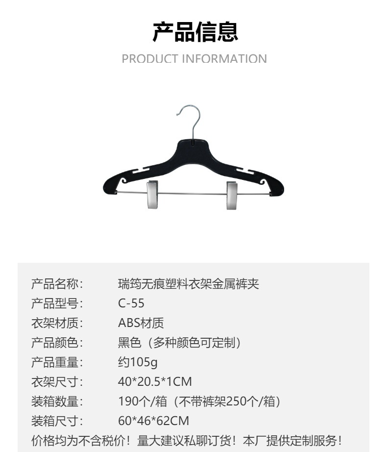 • 바지 클립이 없는 검정색 플라스틱 옷걸이 C-55