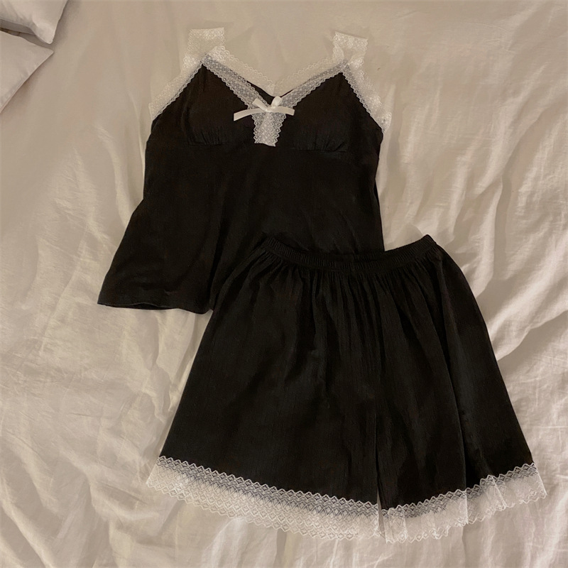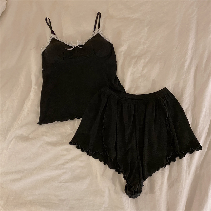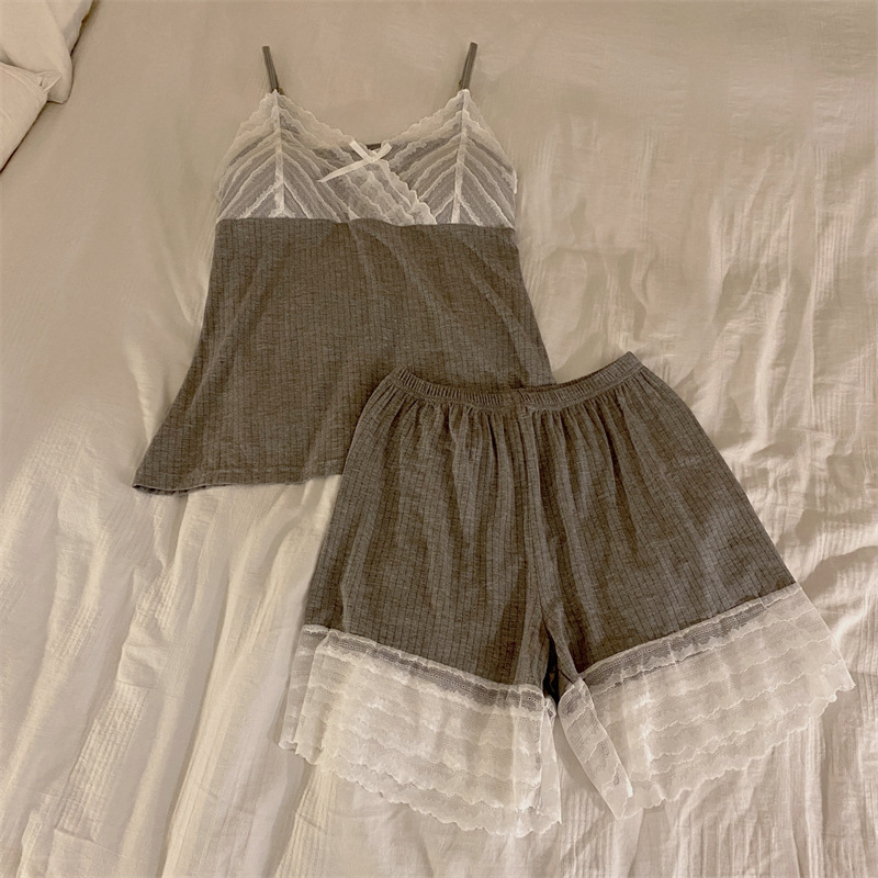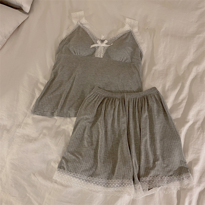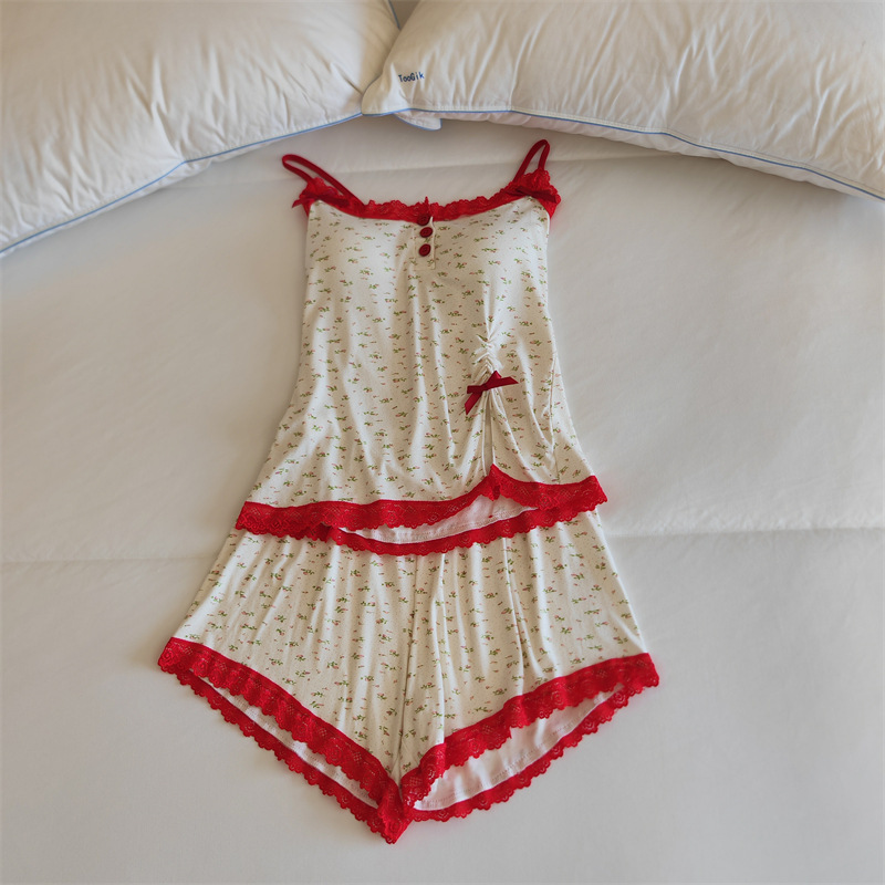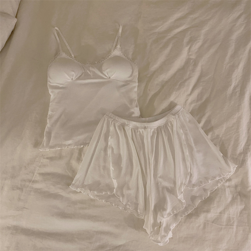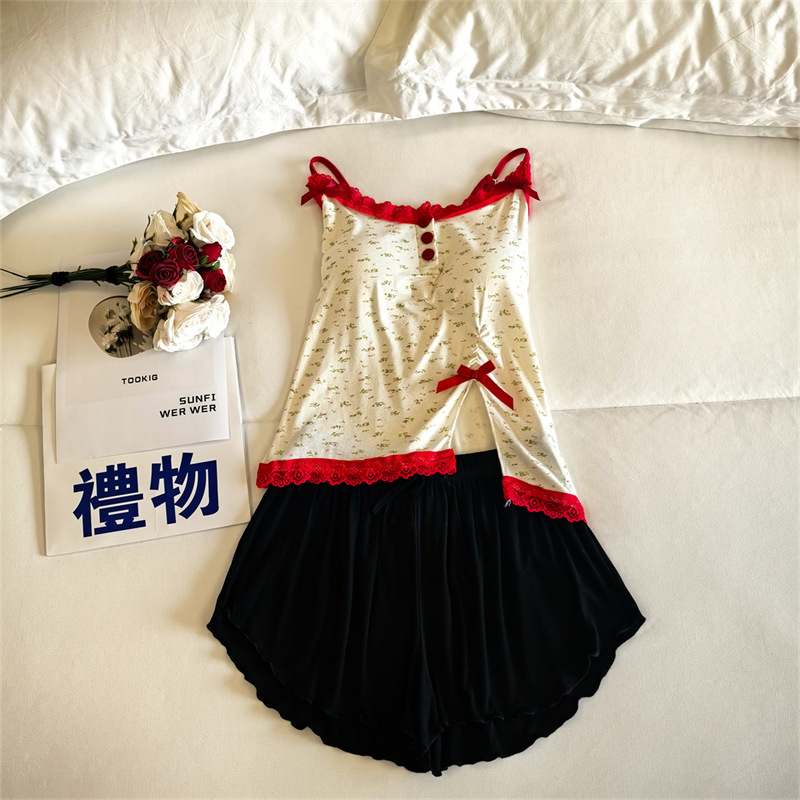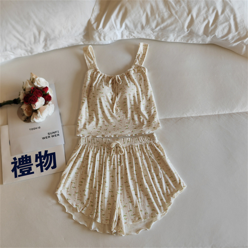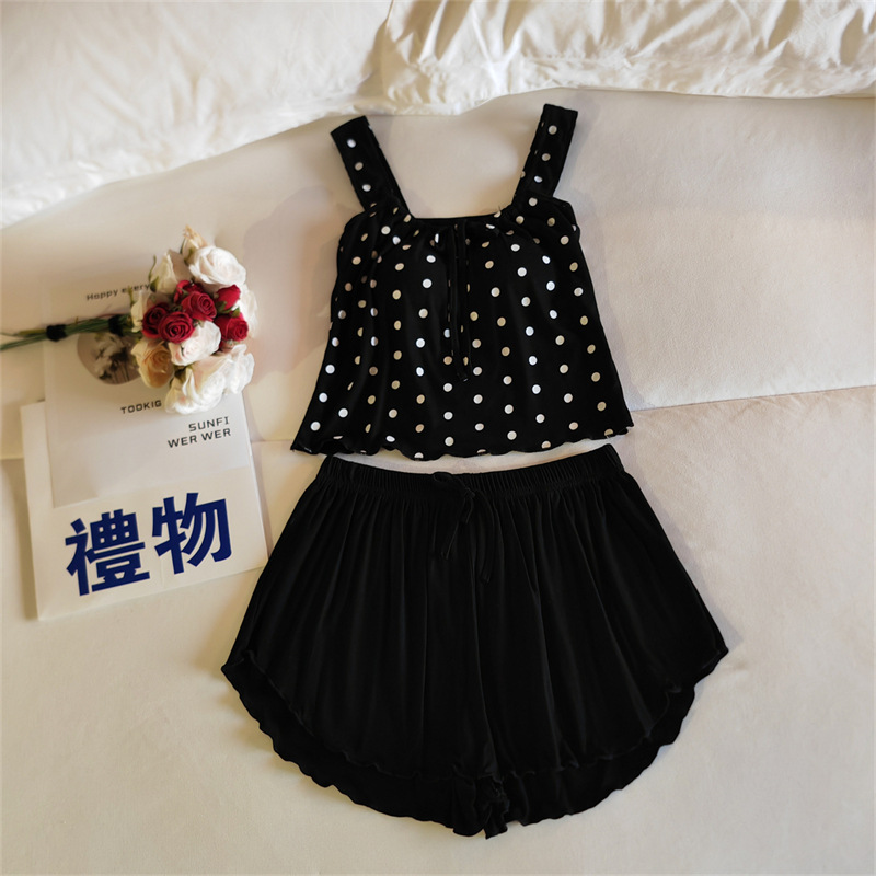 가슴 패드 여성의 여름 슬링 반바지 섹시한 귀 얇은 귀여운 폴라 도트 여성의 홈 의류 세트
