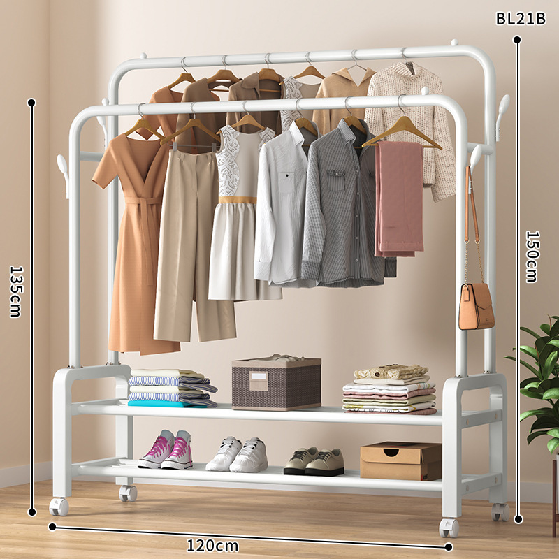 • 측면 수납망 단층 이중봉 + 옷걸이 130 흰색 + 바퀴 ®