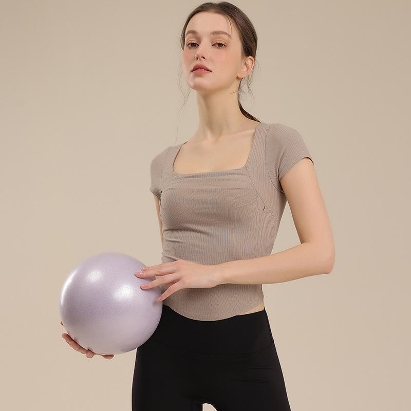 리브 주름 허리 스포츠 반팔 사각 목 슬림-가슴 매트 요가 옷으로 슬리밍 통기성 탄성 피트니스 탑스토어 가기