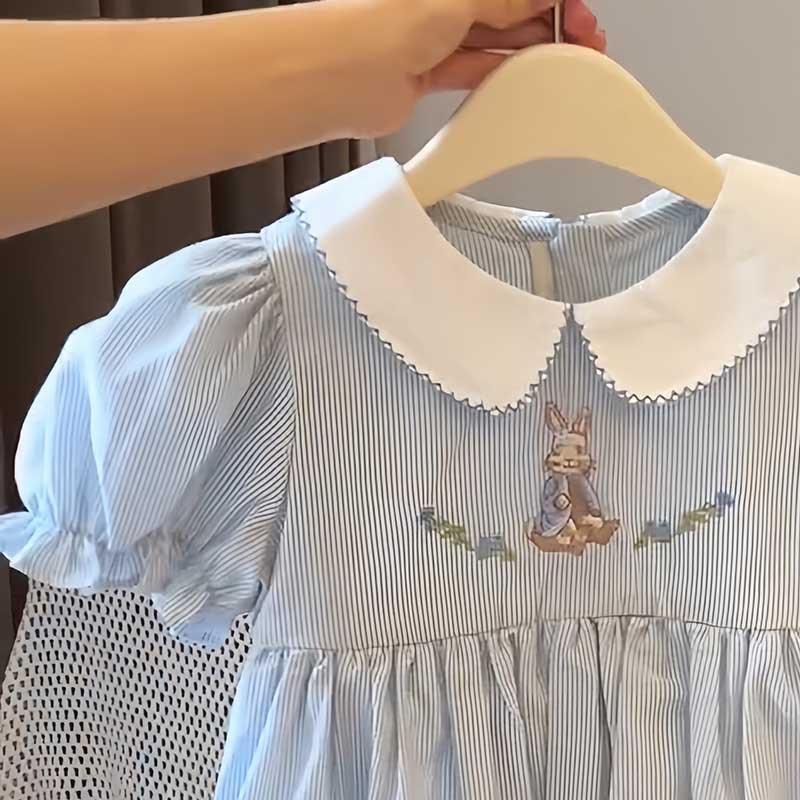 소녀 원피스 여름 2025 새로운 소녀 아기 소녀 세련된 어린이 거품 소매 패션 줄무늬 흰 토끼 치마