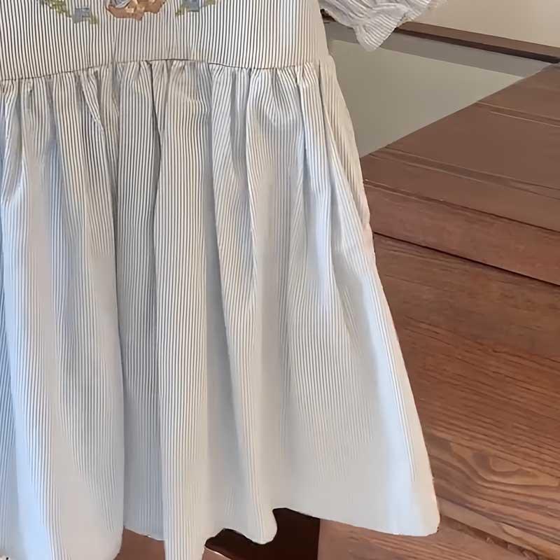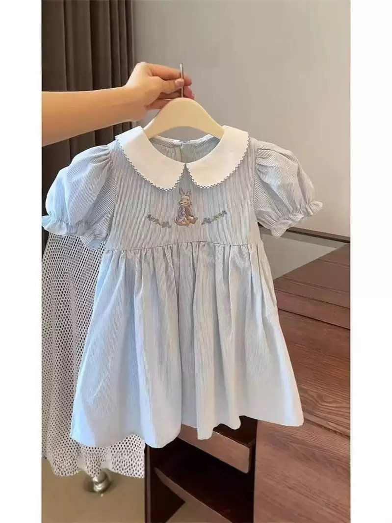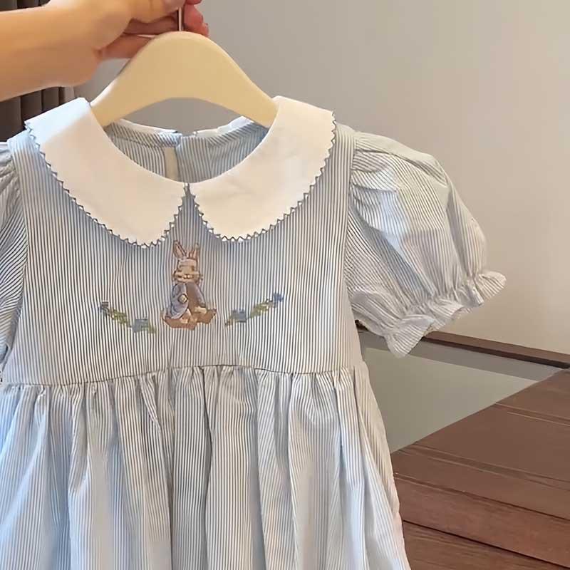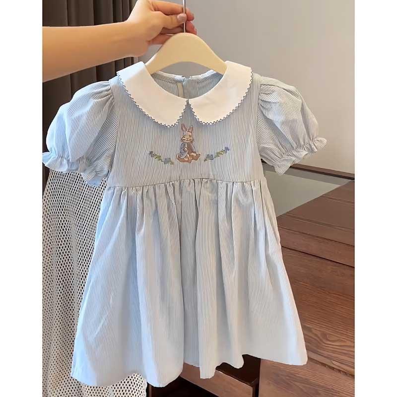 소녀 원피스 여름 2025 새로운 소녀 아기 소녀 세련된 어린이 거품 소매 패션 줄무늬 흰 토끼 치마스토어 가기