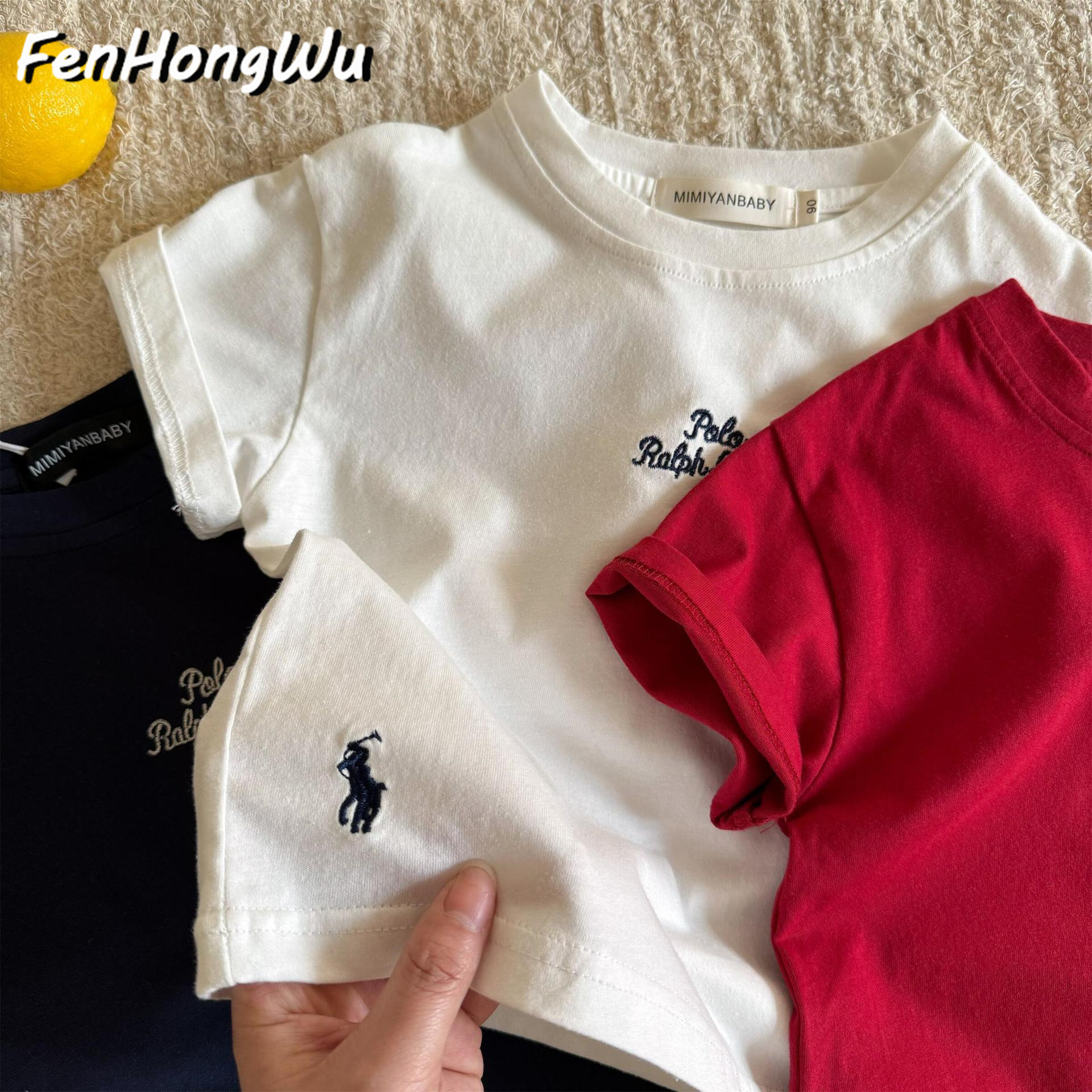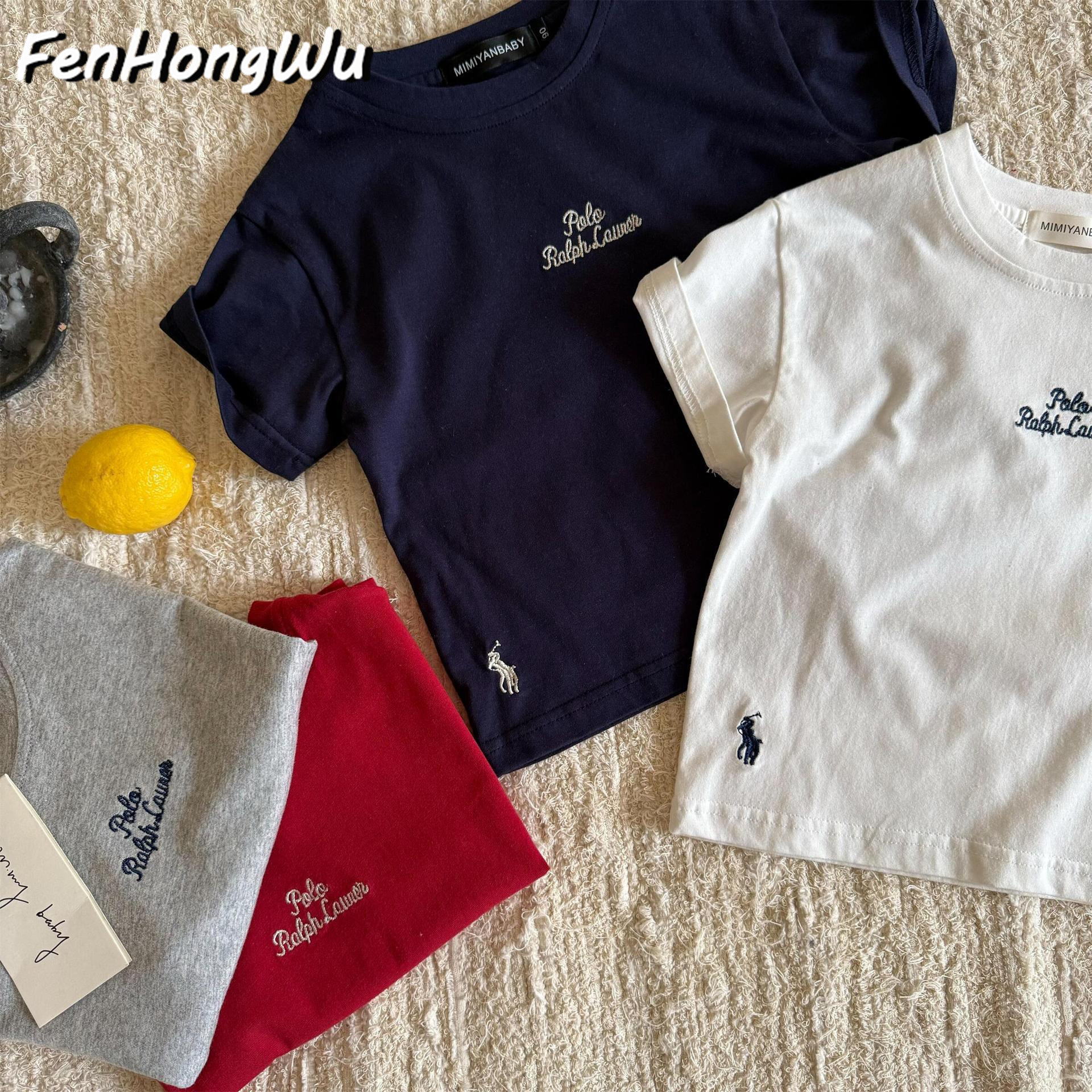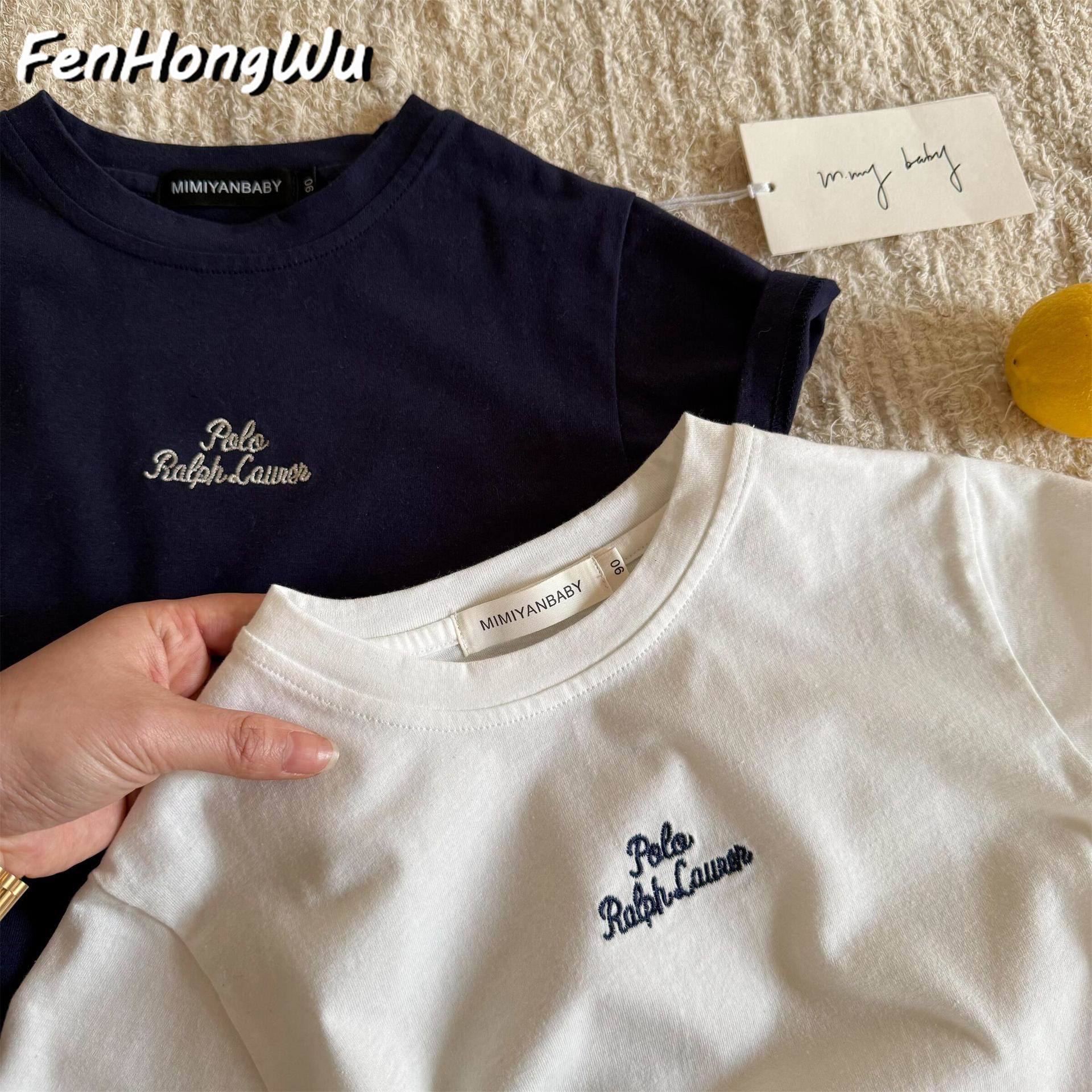 [핑크 하우스] 어린이 반팔 여름 새 소녀와 소년 줄무늬 자수 짧은 소매 T 아기 간단한 편지 티셔츠스토어 가기