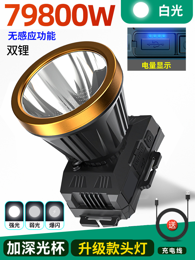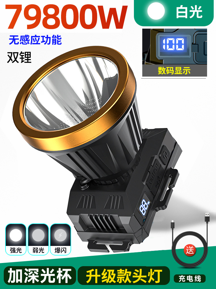 • 듀얼 리튬 배터리 79800W 백색광 [500시간] 디지털 디스플레이 + 유도 없음 [더 큰 광점] 헤드 로프 + 데이터 케이블 장착