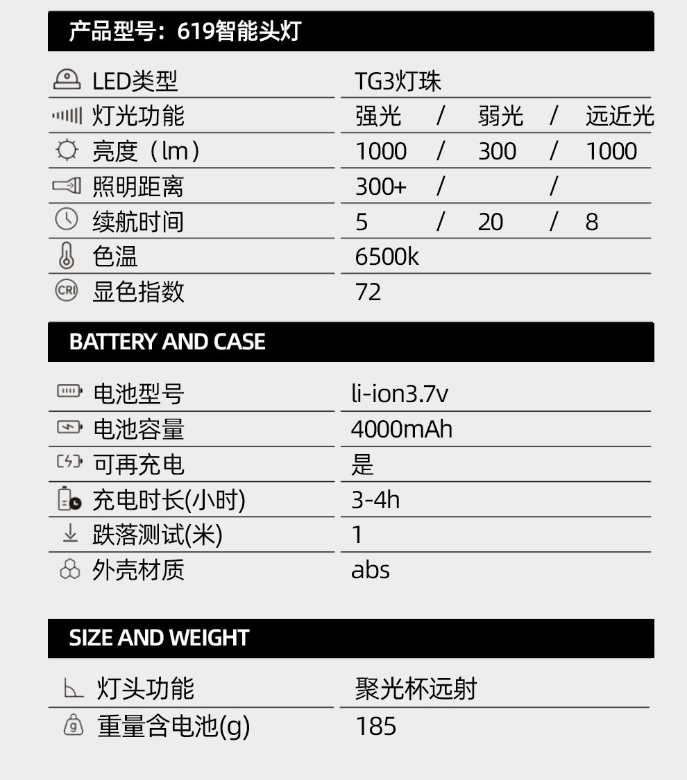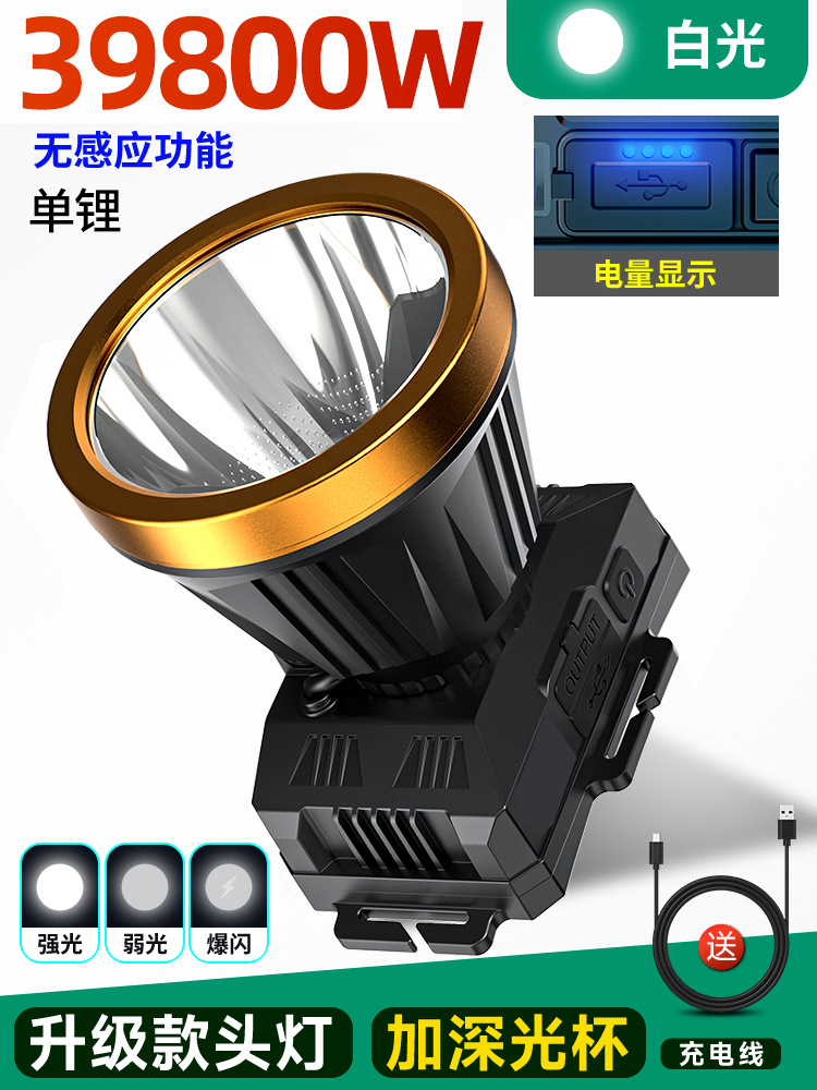 • 단일 리튬 배터리 39800W 백색광 [100시간] 유도 없음 [더 큰 광점] 헤드밴드 + 데이터 케이블 장착