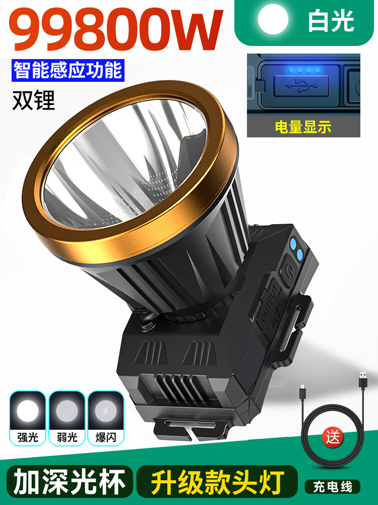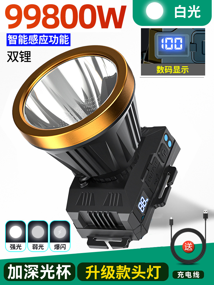• 듀얼 리튬 배터리 99800W 백색광[700시간] 디지털 디스플레이 + 센서 장착[더 큰 광점] 헤드밴드 + 데이터 케이블 장착