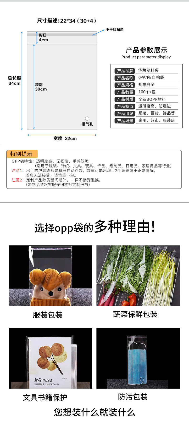 • OPP 투명 접착식 가방, 22*34(30+4)9 실크(공기 구멍 포함)