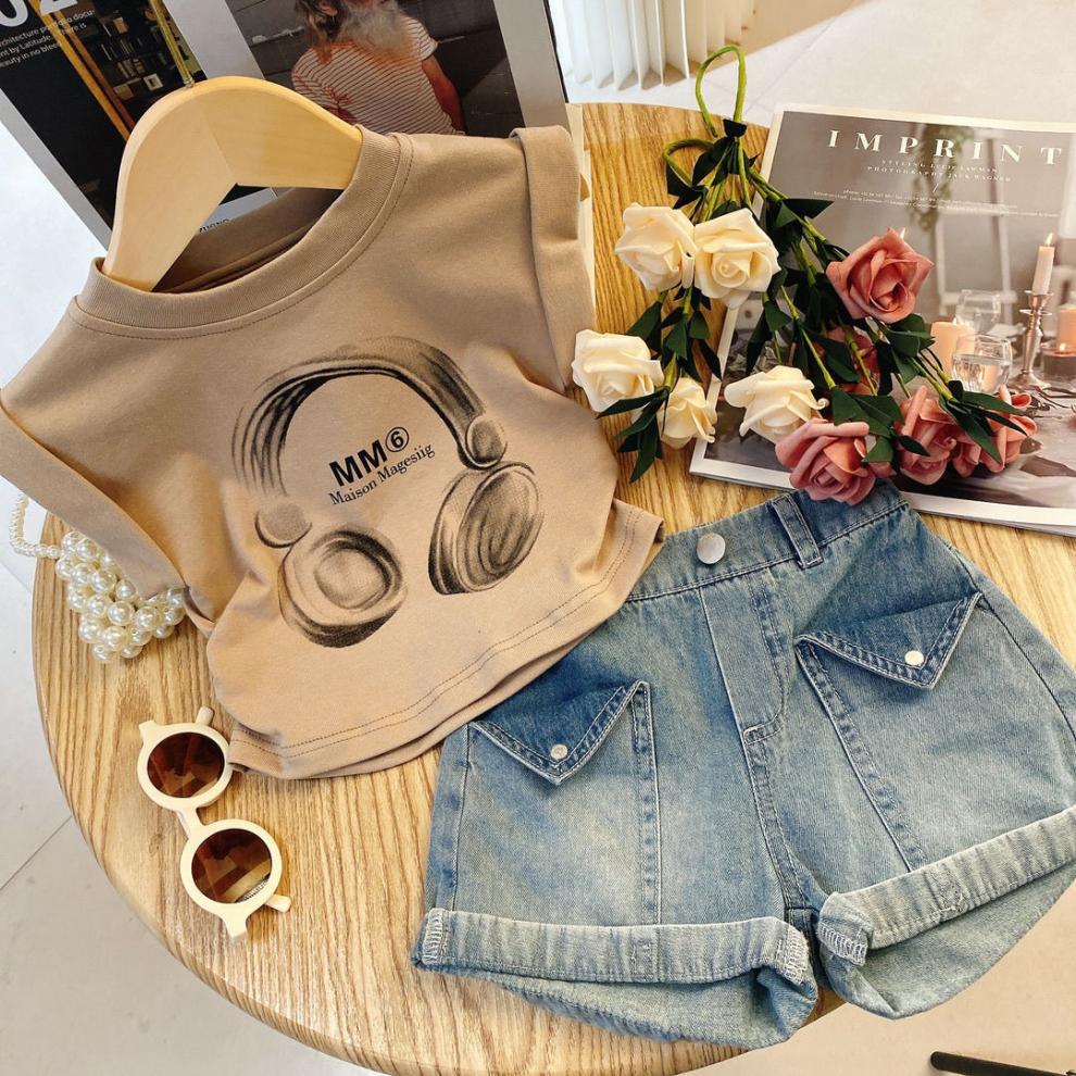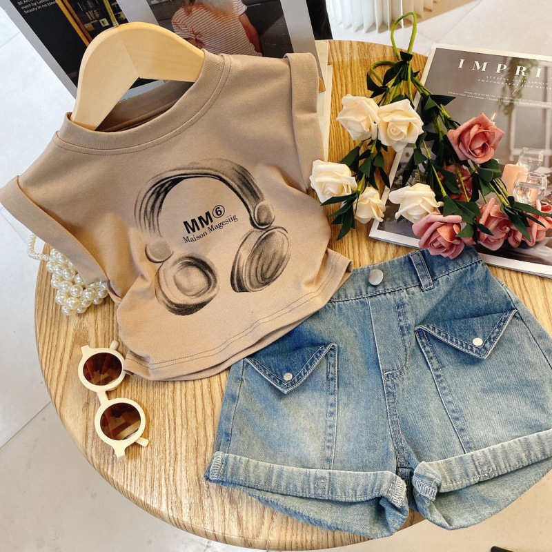 여자 세트 2025 여름 새 어린이 민소매 티셔츠 스타일 투피스 아기 소녀 여름 데님 반바지 세트스토어 가기