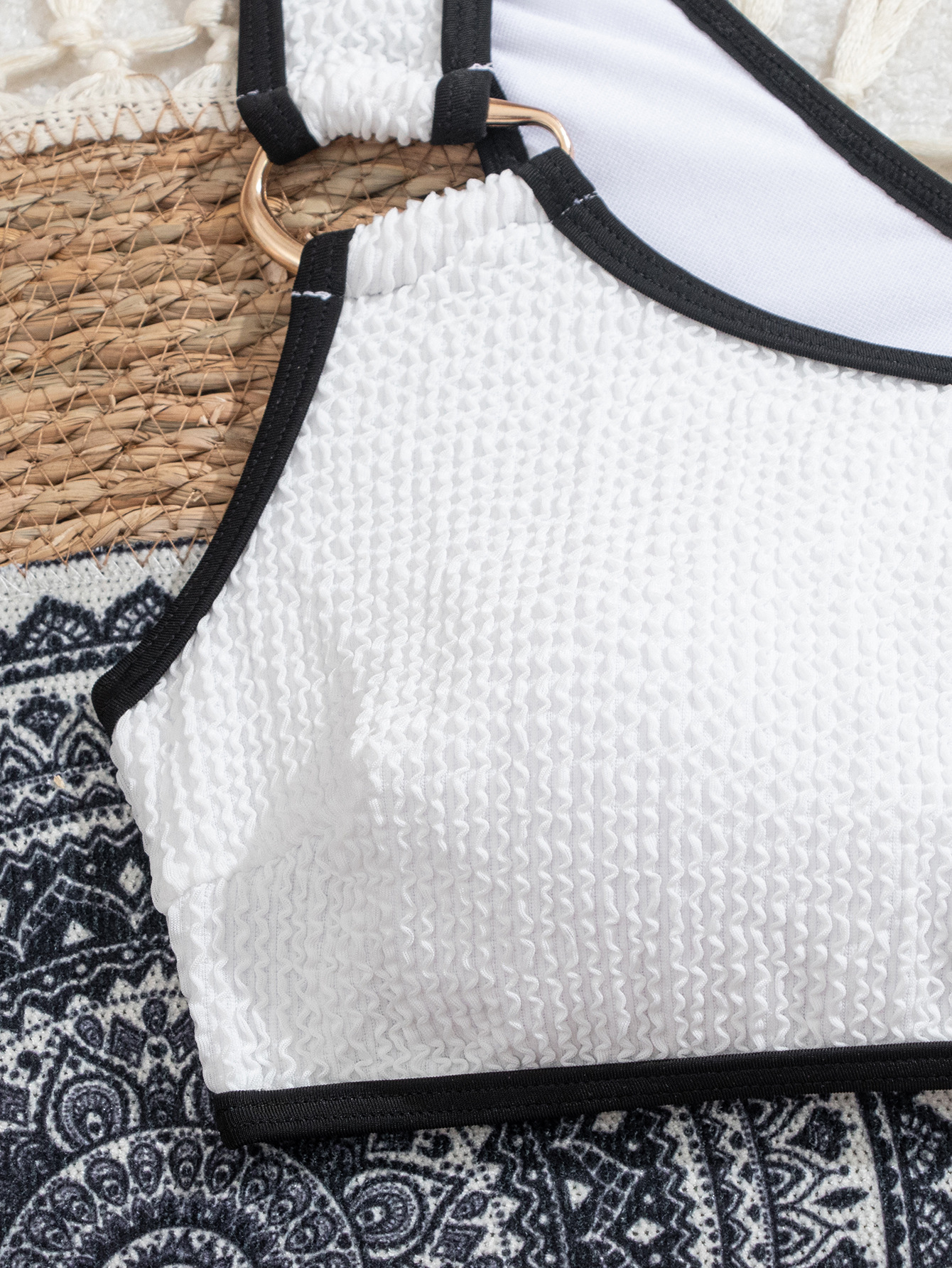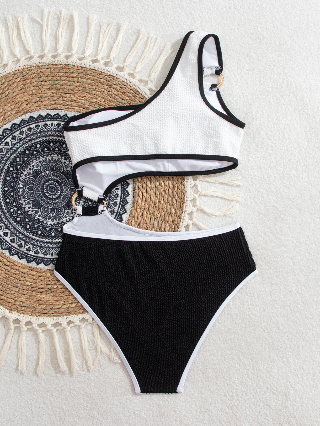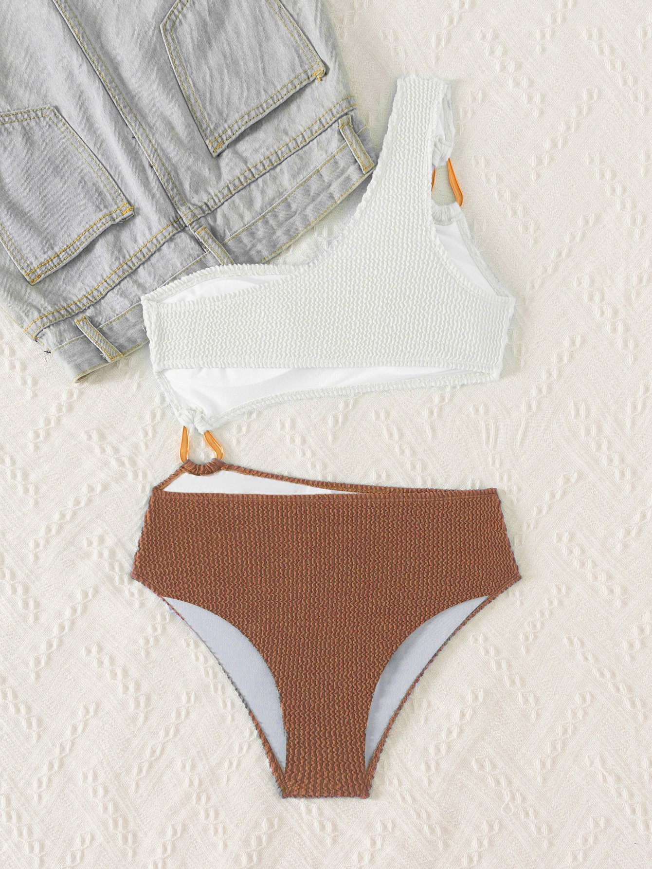 2025 원숄더 수영복 메탈 링 대비 컬러 패치 워크 비키니 수영복 세트