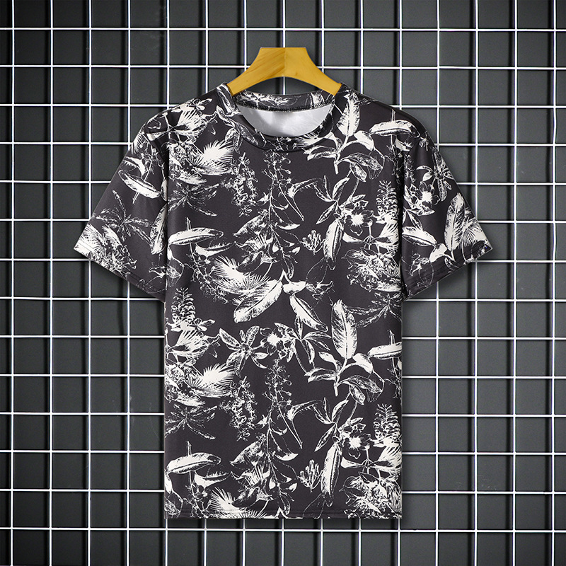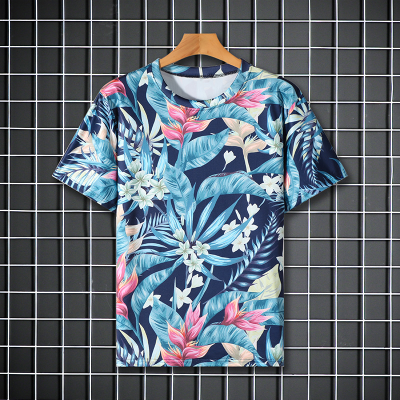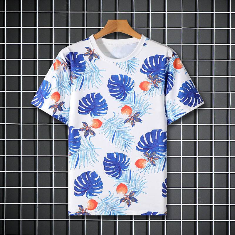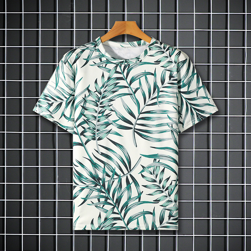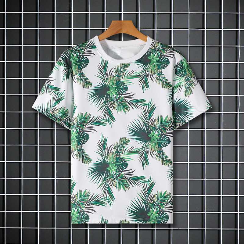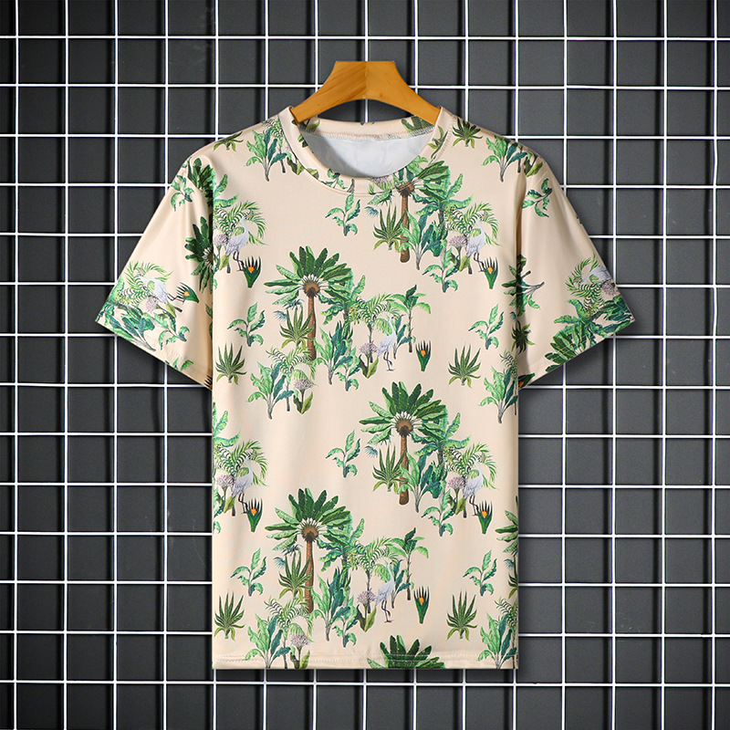 공장 도매 하와이 해변 남성 아이스 실크 얇은 휴일 아이스 실크 여름 트렌드 라운드 넥 짧은 소매 티셔츠스토어 가기