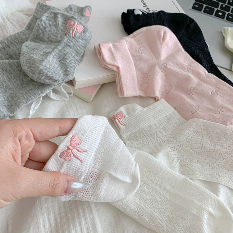 2024 양말 여성의 봄과 여름 새로운 일본 단색 보트 양말 Heel Bow 수 놓은 보이지 않는 면화 양말 Ins 트렌디