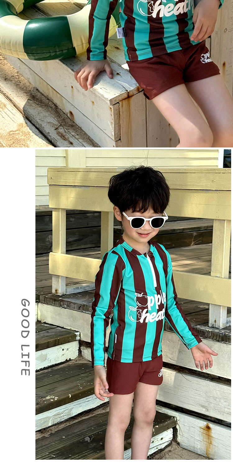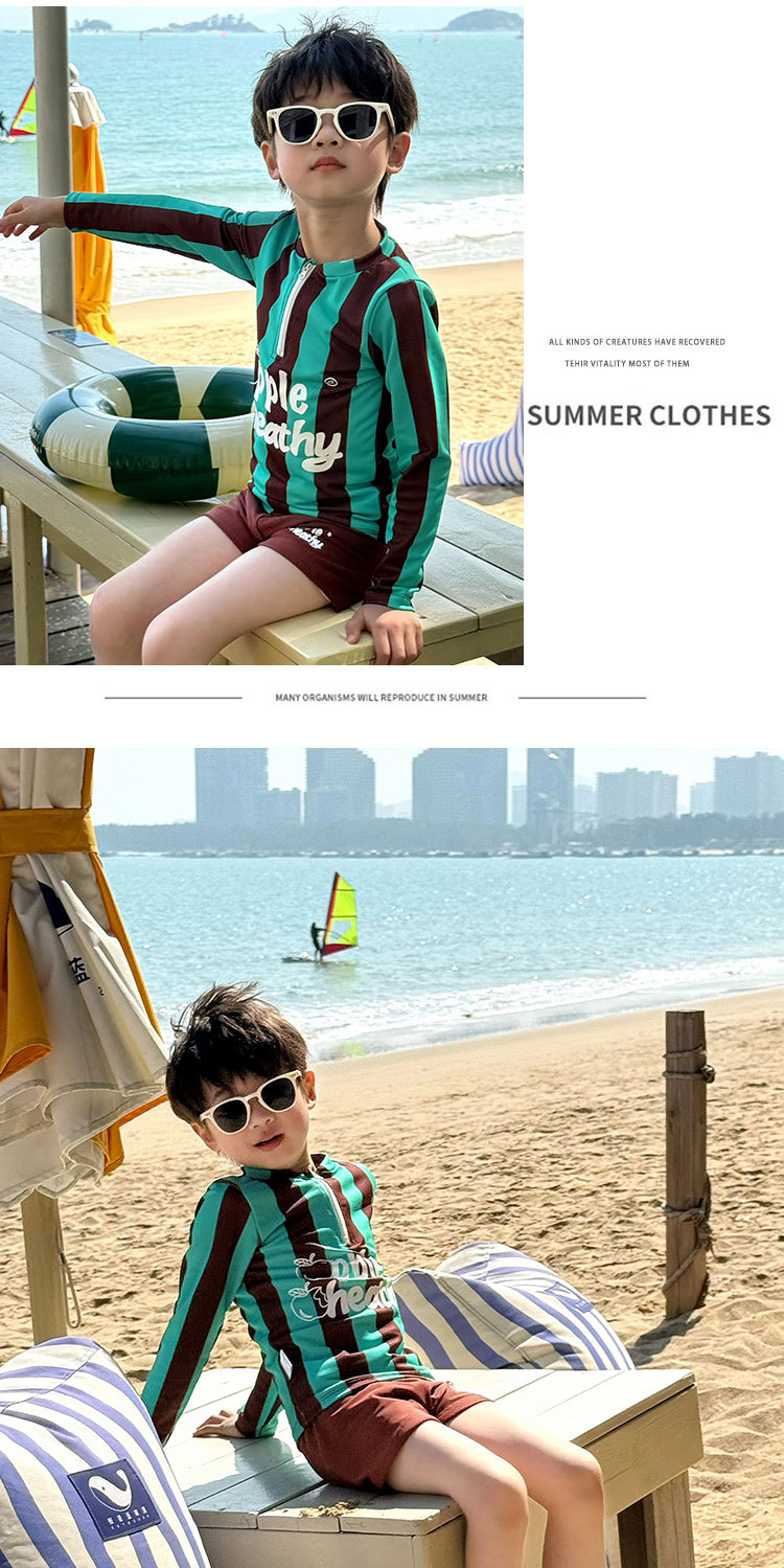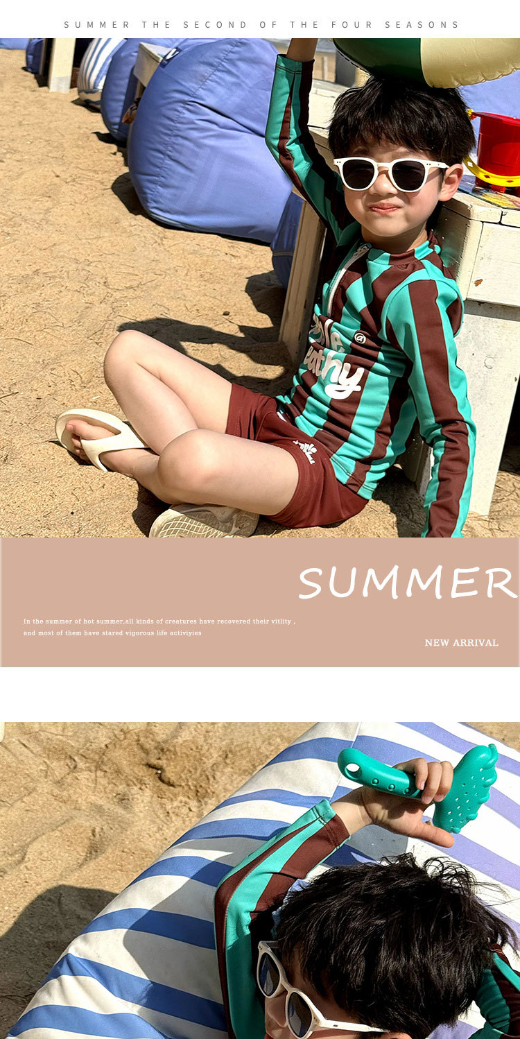 새로운 어린이 수영복 소년과 소녀 아기 긴 소매 태양 보호 수영복 세트 스트라이프 컬러 대조 패션 뜨거운 봄 휴일 수영복스토어 가기