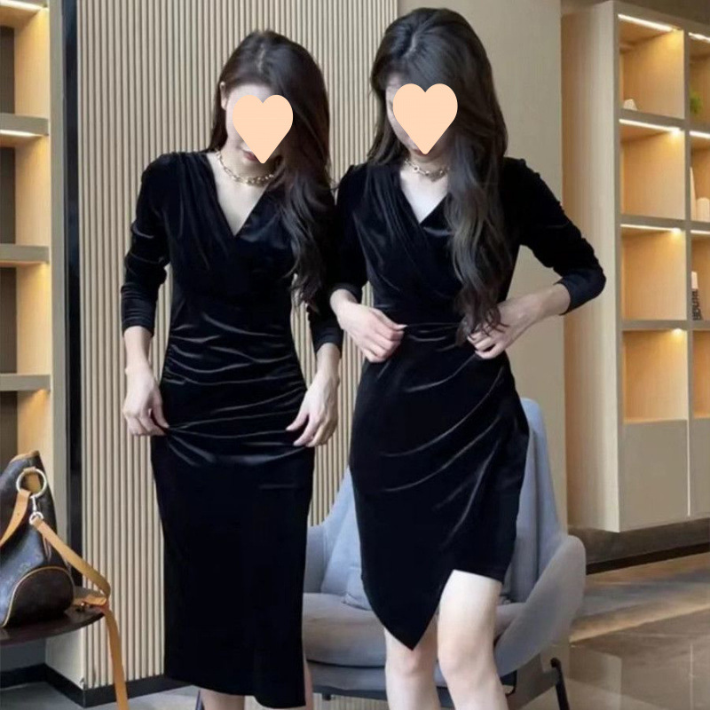 봄과 가을 우아한 슬리밍 배꼽 커버 벨벳 원피스 헵번 스타일 프랑스 하이 엔드 스플릿 스커트스토어 가기