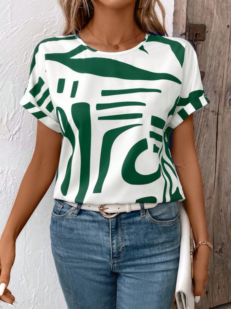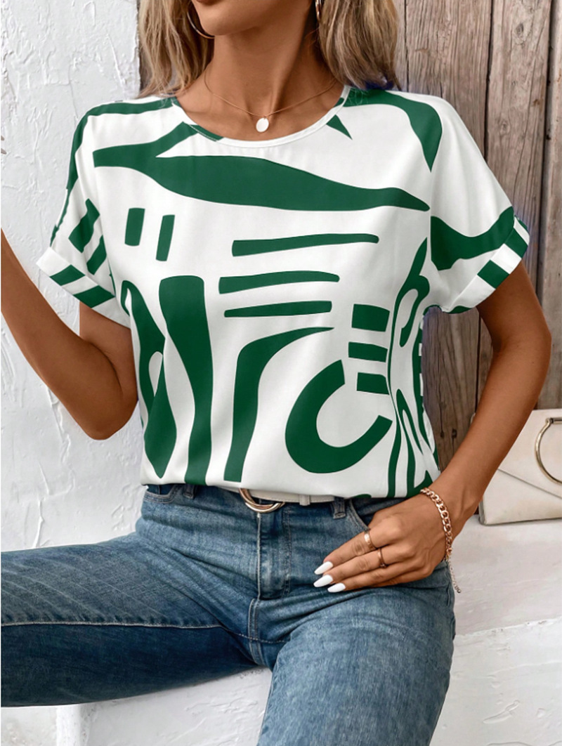 아마존 독립 역 2025 새로운 유럽 및 미국 여름 최고 국경 박쥐 소매 크루 넥 기하학적 인쇄 셔츠